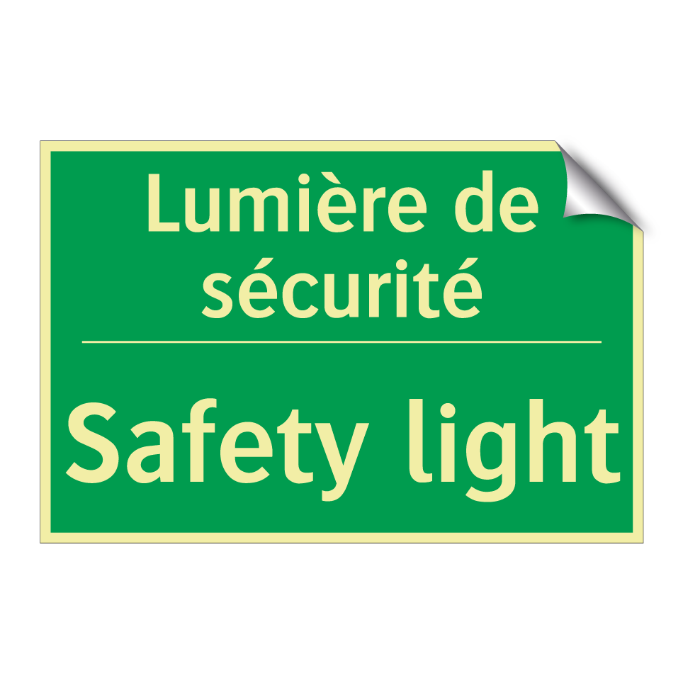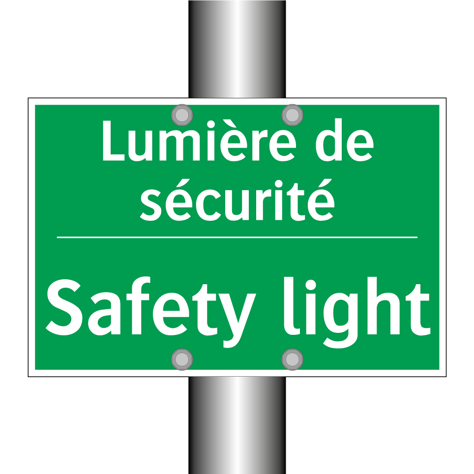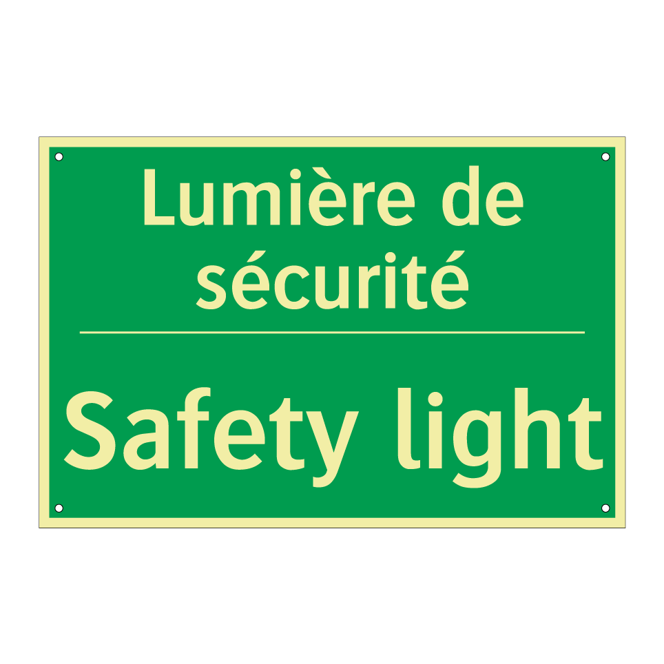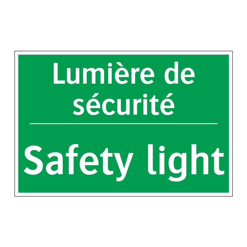 Panneau de secours bilingue avec texte en français : "Lumière de sécurité", et en anglais : "Safety light"