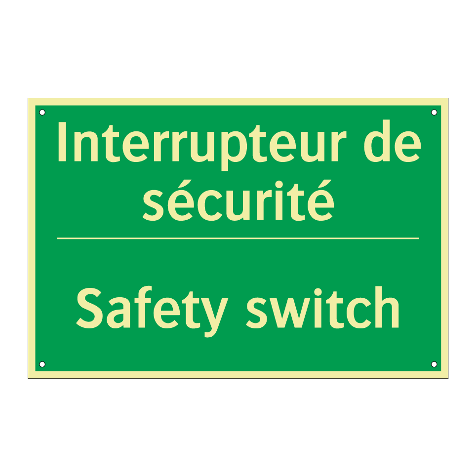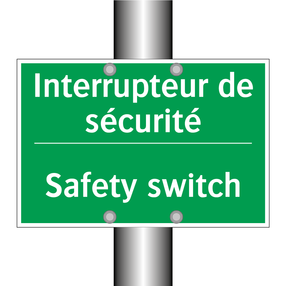Panneau de secours bilingue avec texte en français : "Interrupteur de sécurité", et en anglais : "Safety switch"