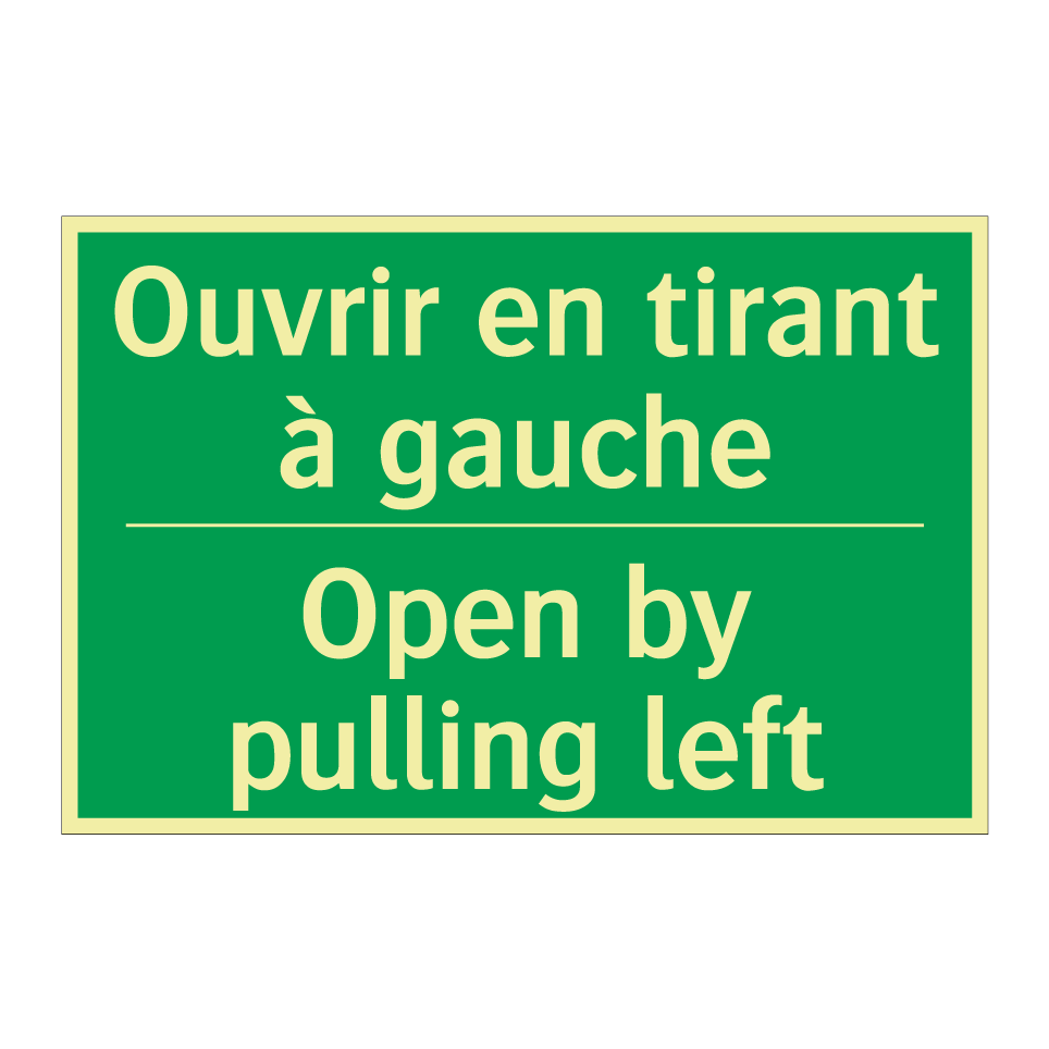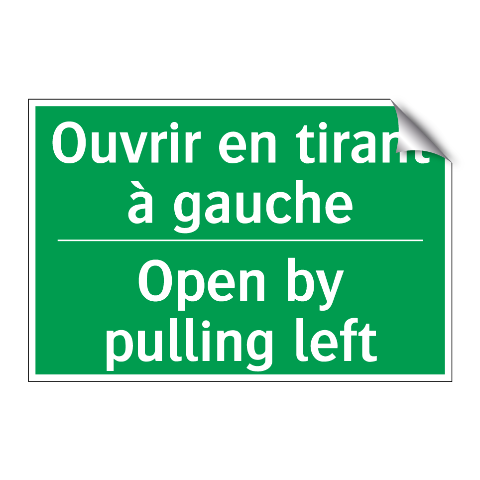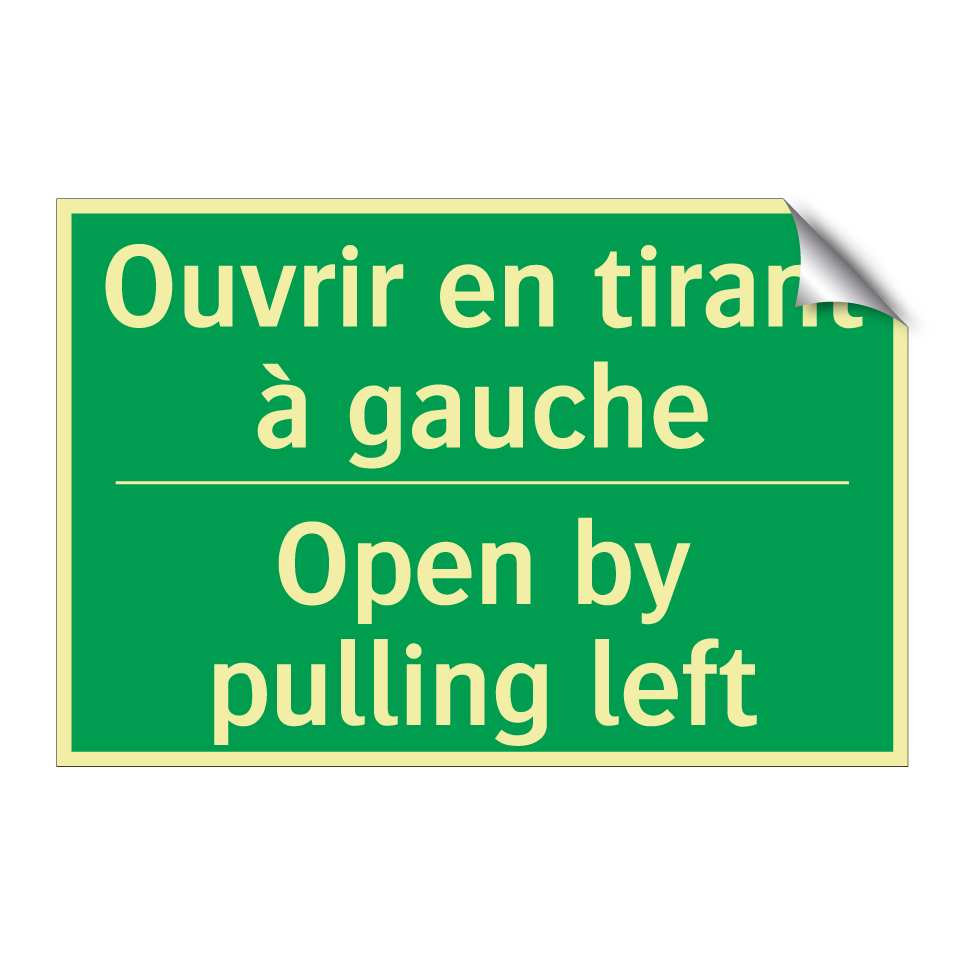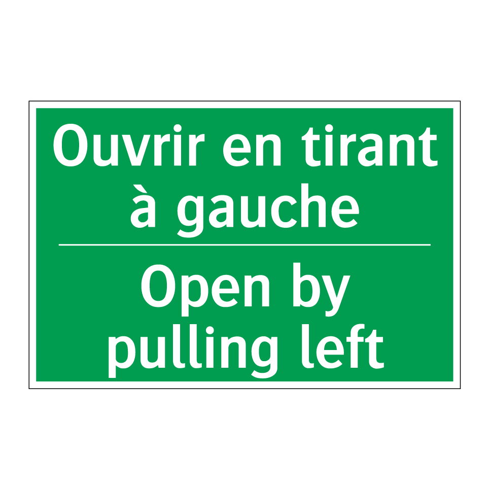 Panneau de secours bilingue avec texte en français : "Ouvrir en tirant à gauche", et en anglais : "Open by pulling left"