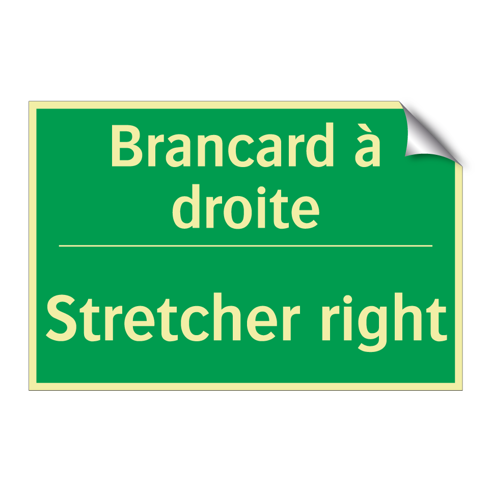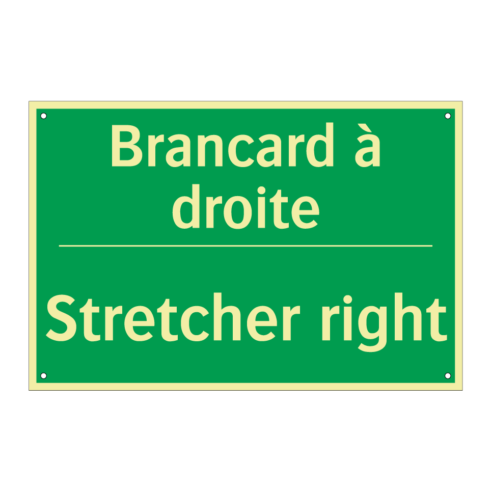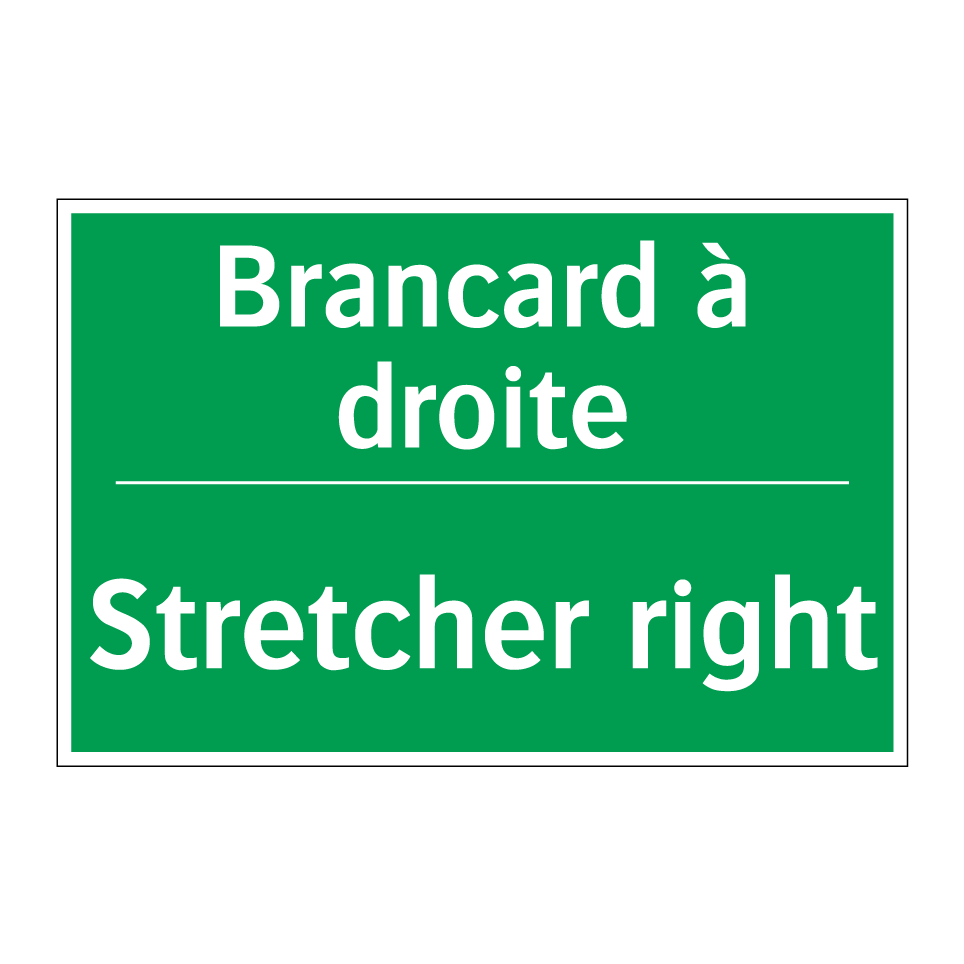 Panneau de secours bilingue avec texte en français : "Brancard à droite", et en anglais : "Stretcher right"