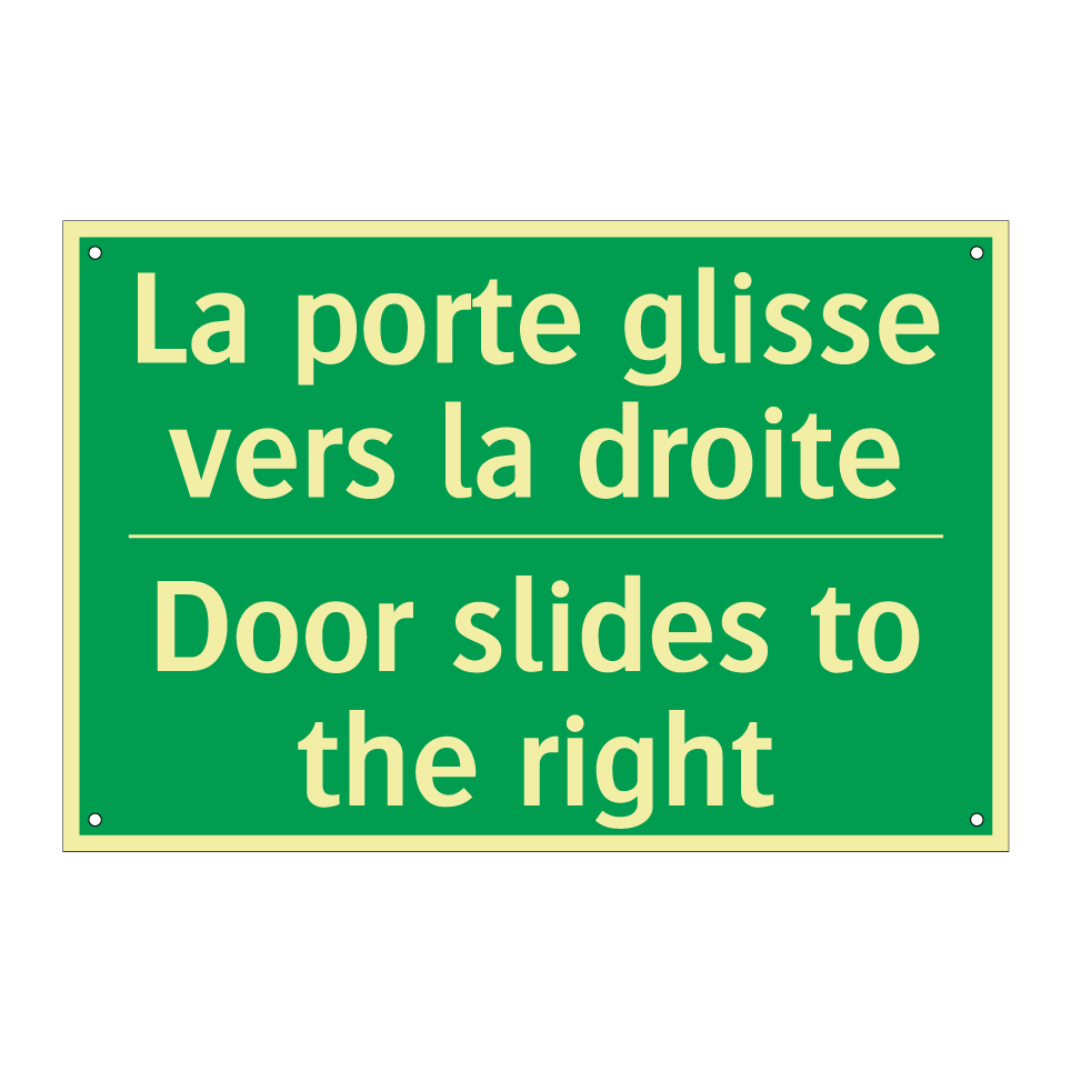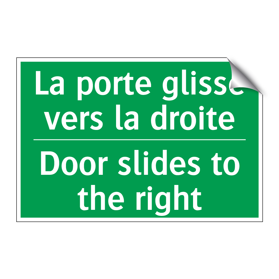 Panneau de secours bilingue avec texte en français : "La porte glisse vers la droite", et en anglais : "Door slides to the right"