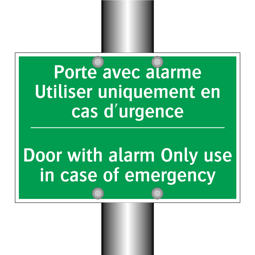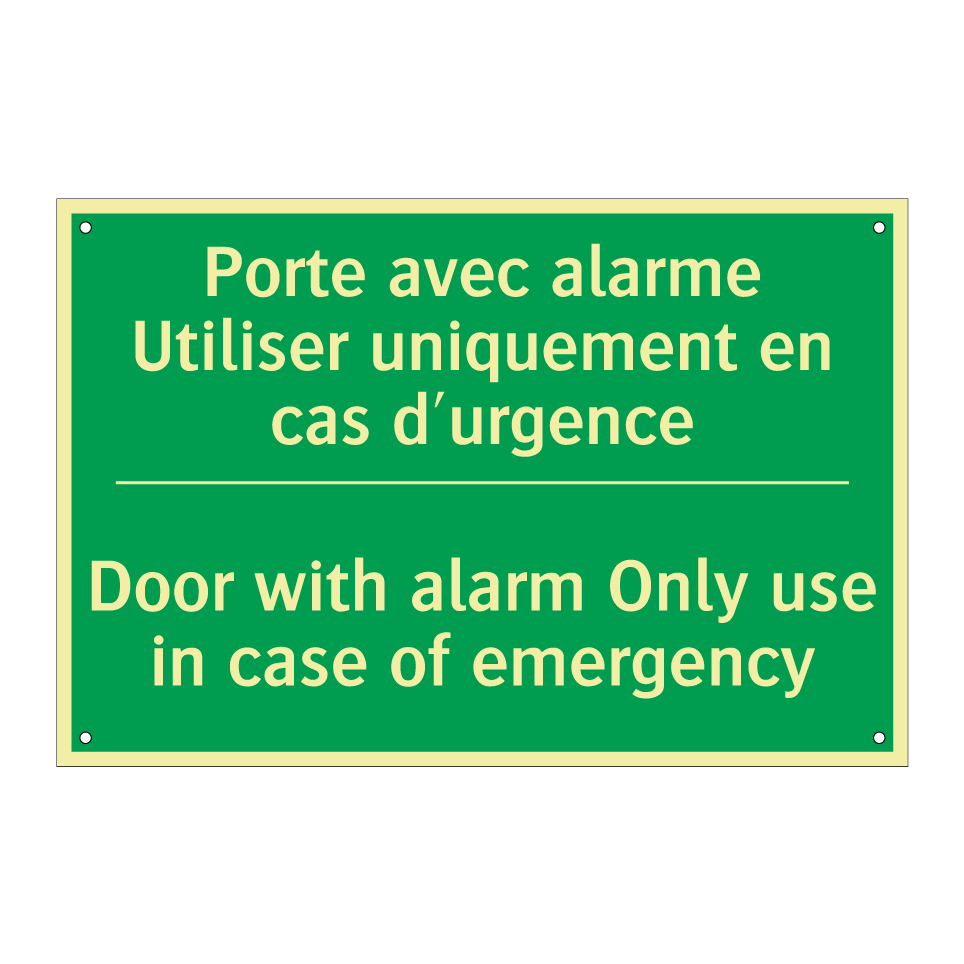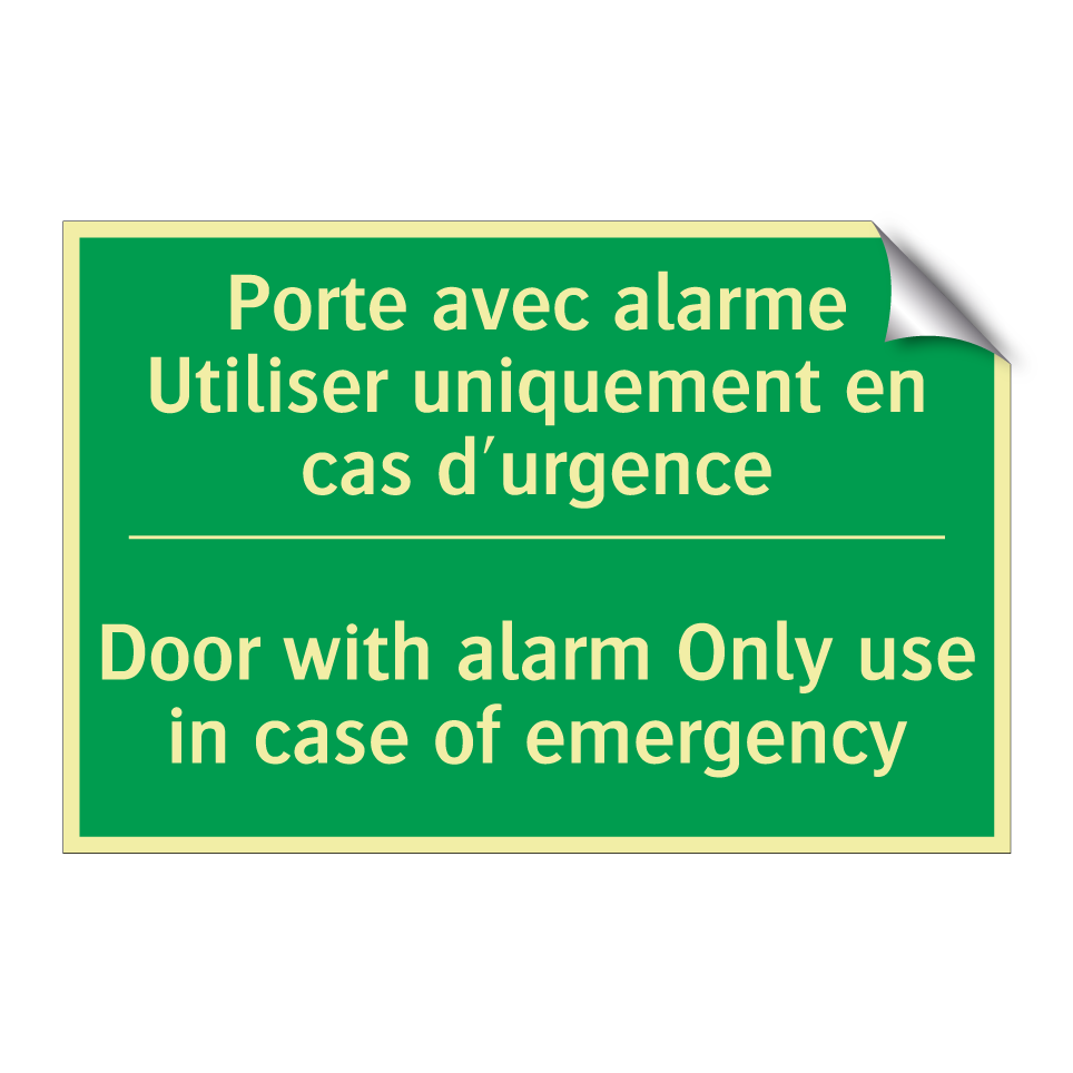 Panneau de secours bilingue avec texte en français : "Porte avec alarme Utiliser uniquement en cas d'urgence", et en anglais : "Door with alarm Only use in case of emergency"
