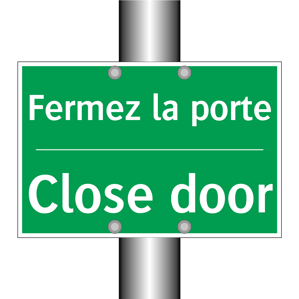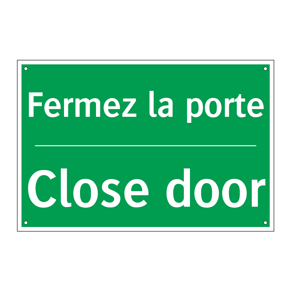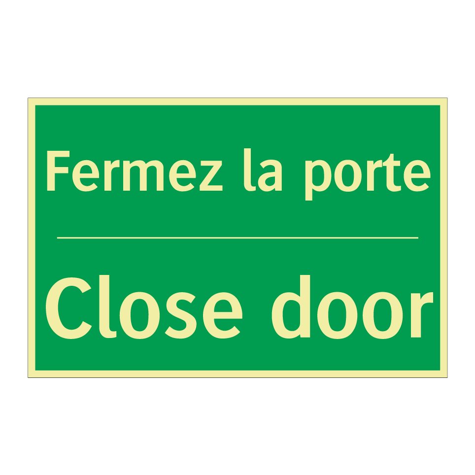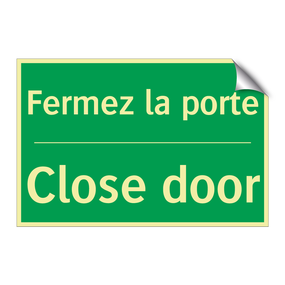 Panneau de secours bilingue avec texte en français : "Fermez la porte", et en anglais : "Close door"