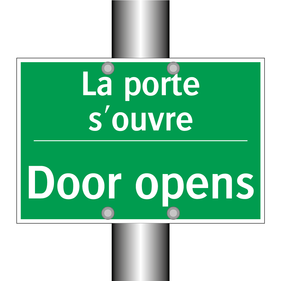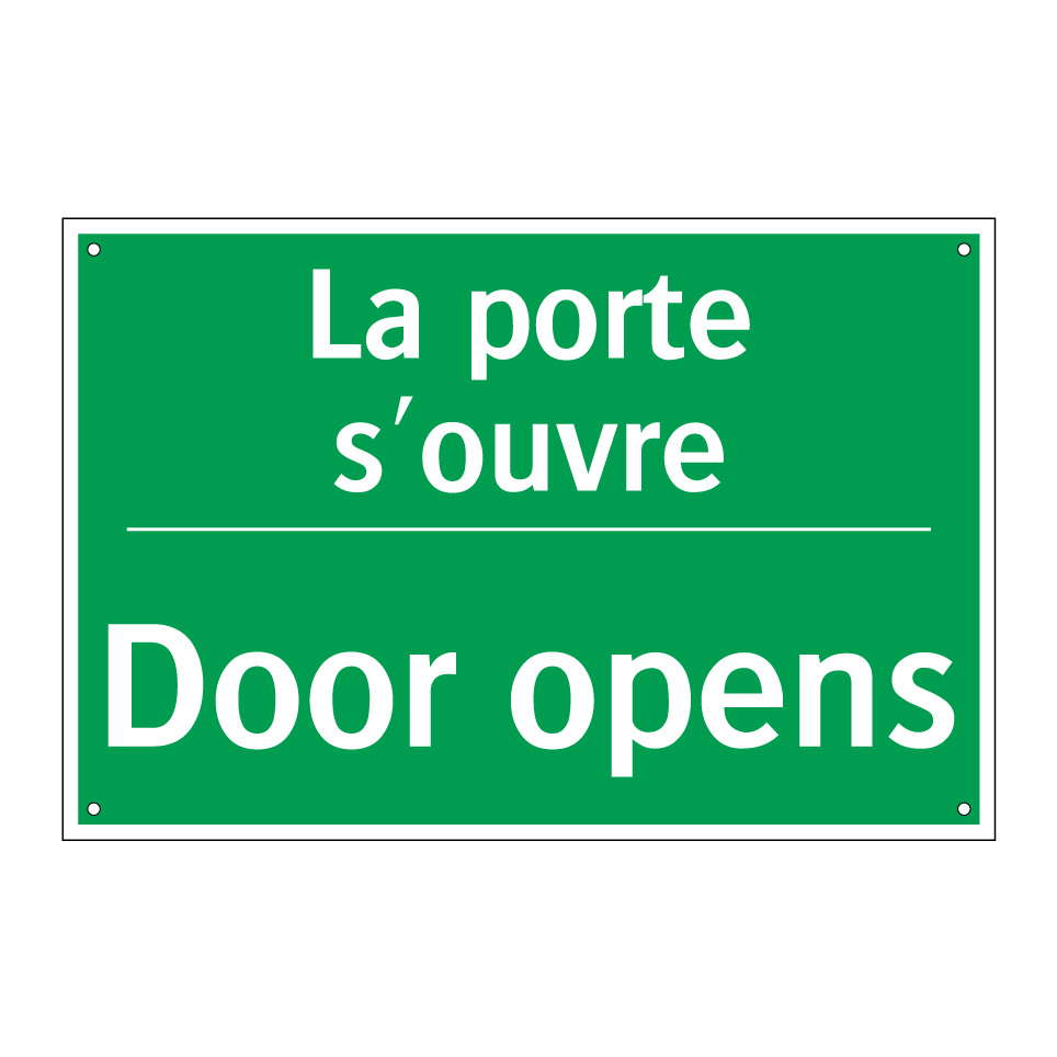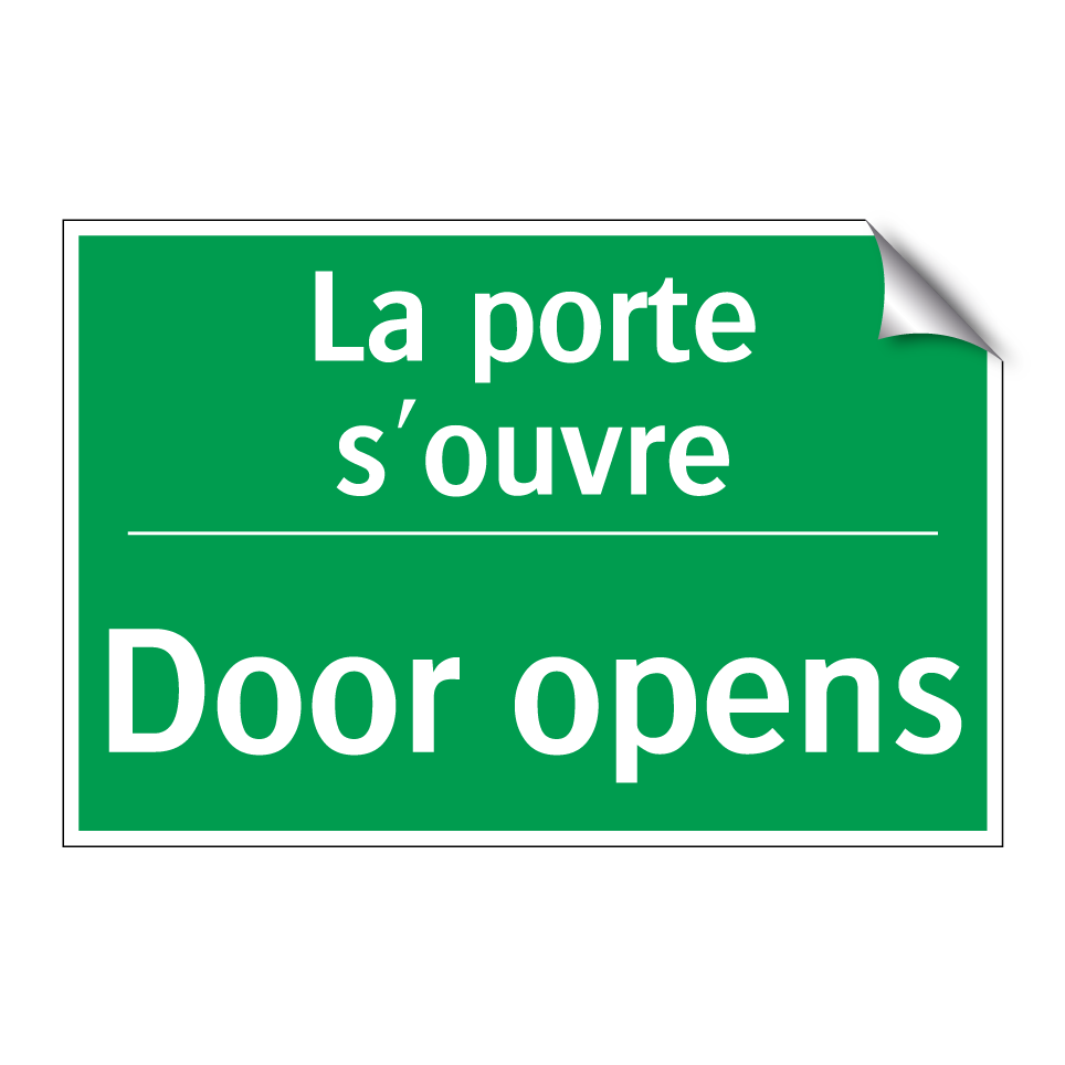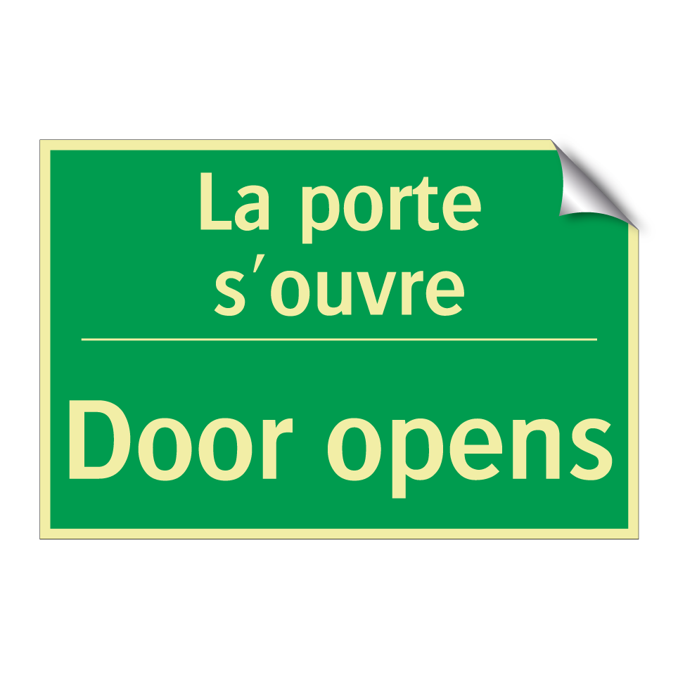 Panneau de secours bilingue avec texte en français : "La porte s'ouvre", et en anglais : "Door opens"