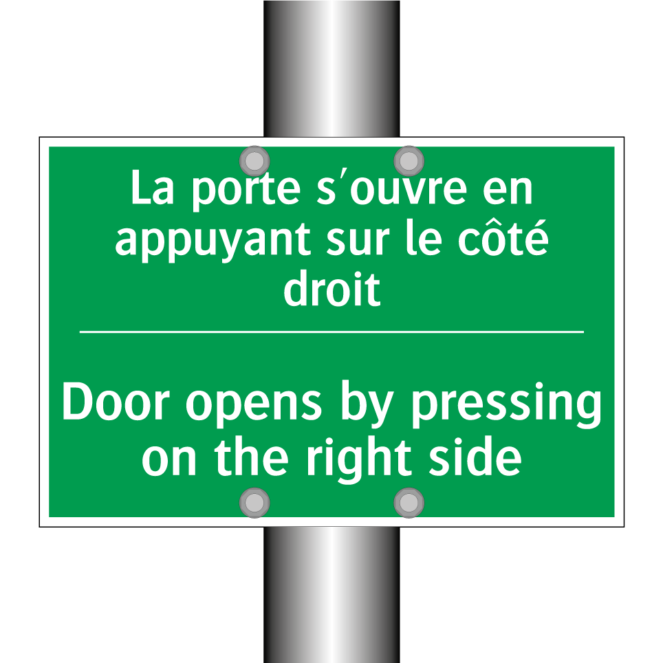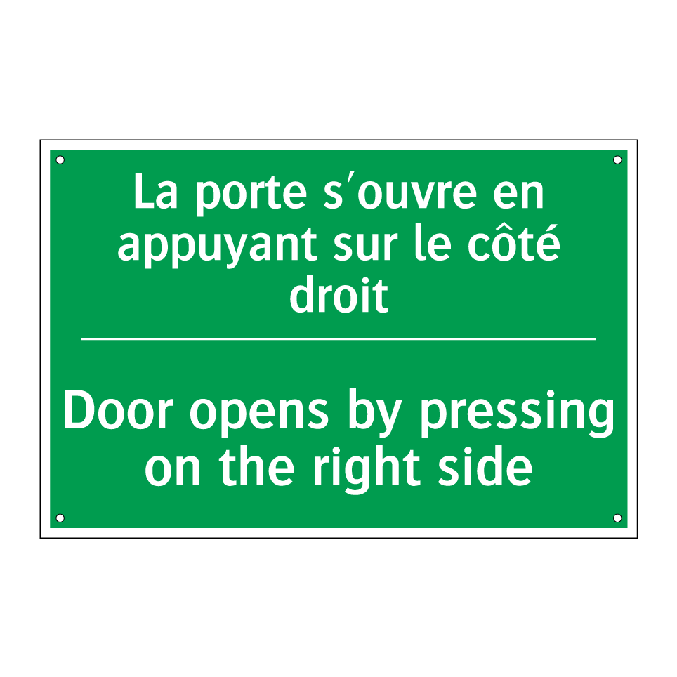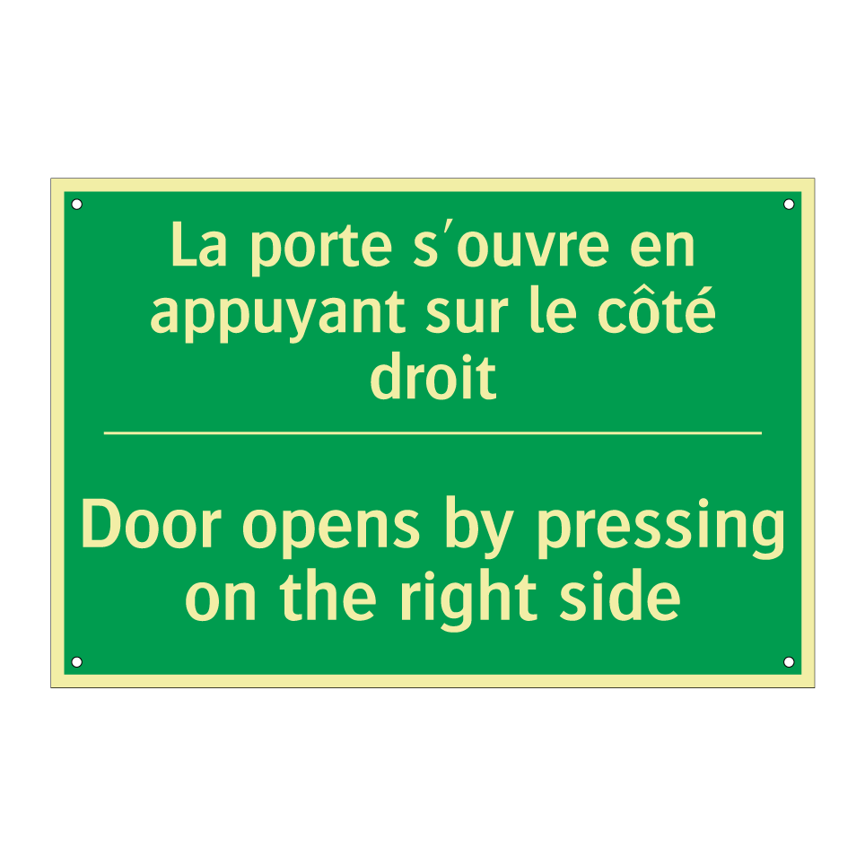 Panneau de secours bilingue avec texte en français : "La porte s'ouvre en appuyant sur le côté droit", et en anglais : "Door opens by pressing on the right side"