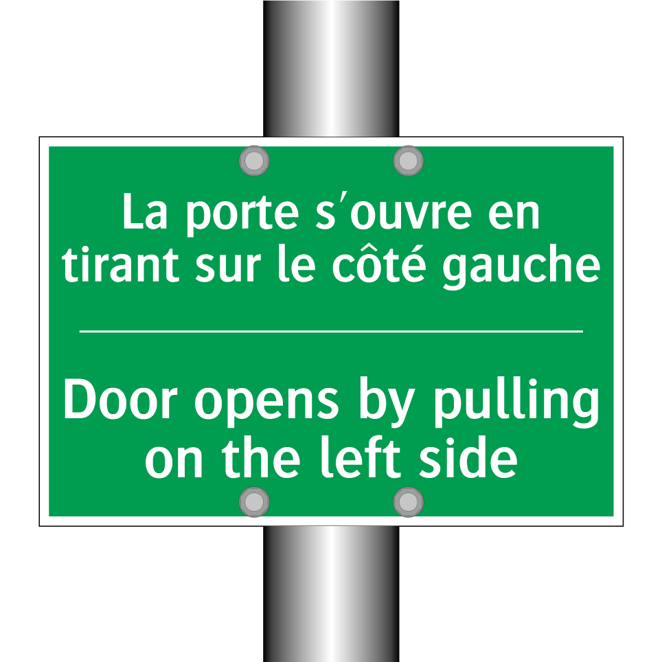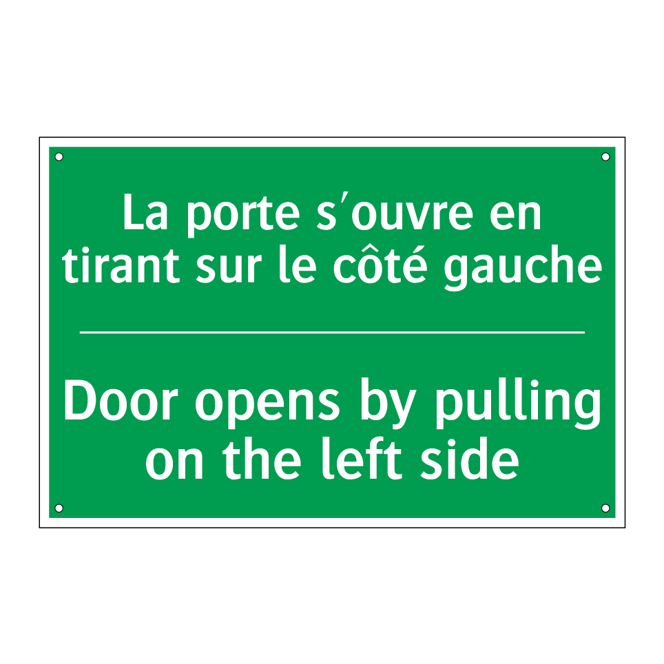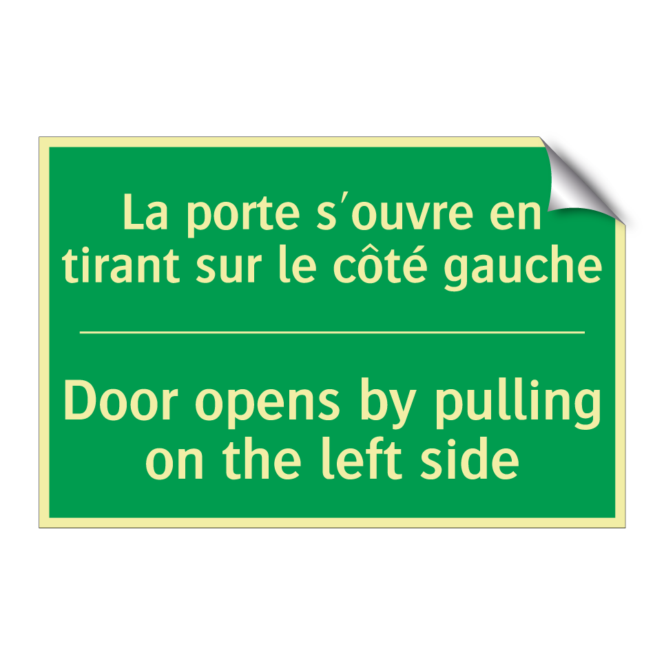 Panneau de secours bilingue avec texte en français : "La porte s'ouvre en tirant sur le côté gauche", et en anglais : "Door opens by pulling on the left side"