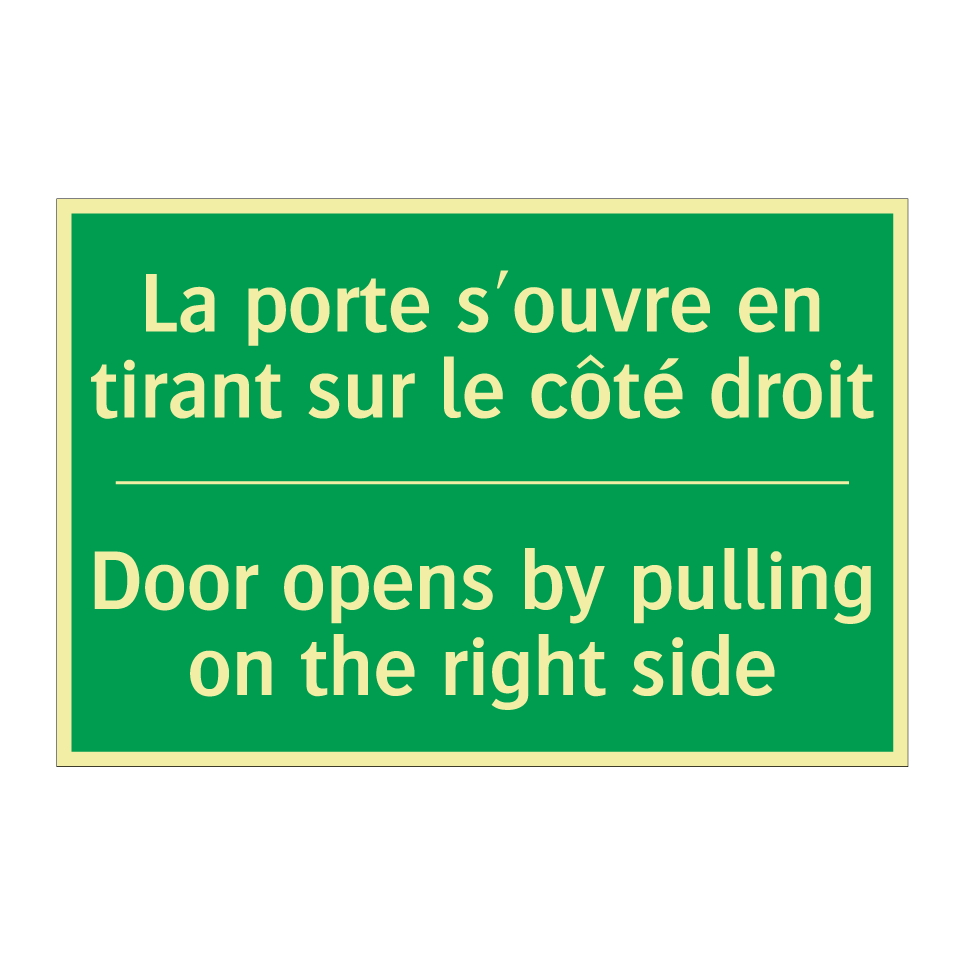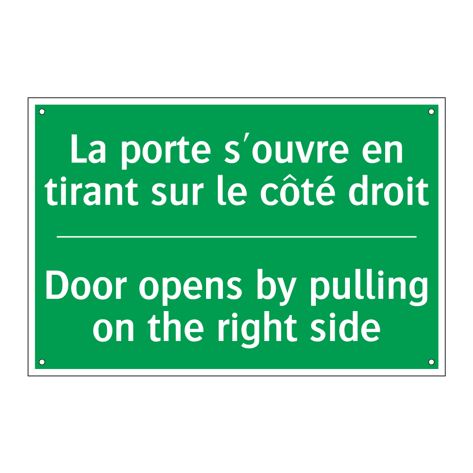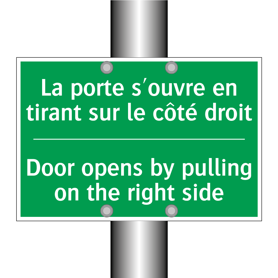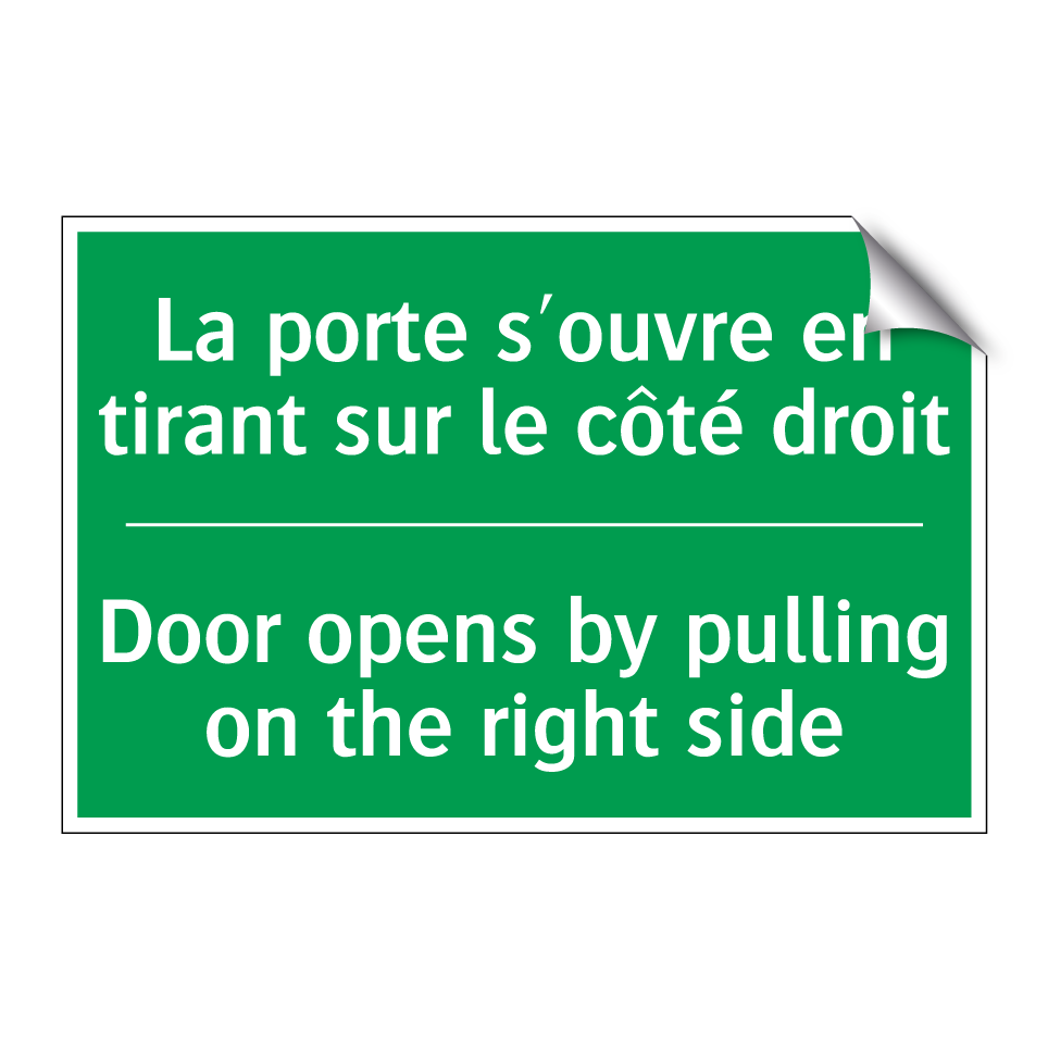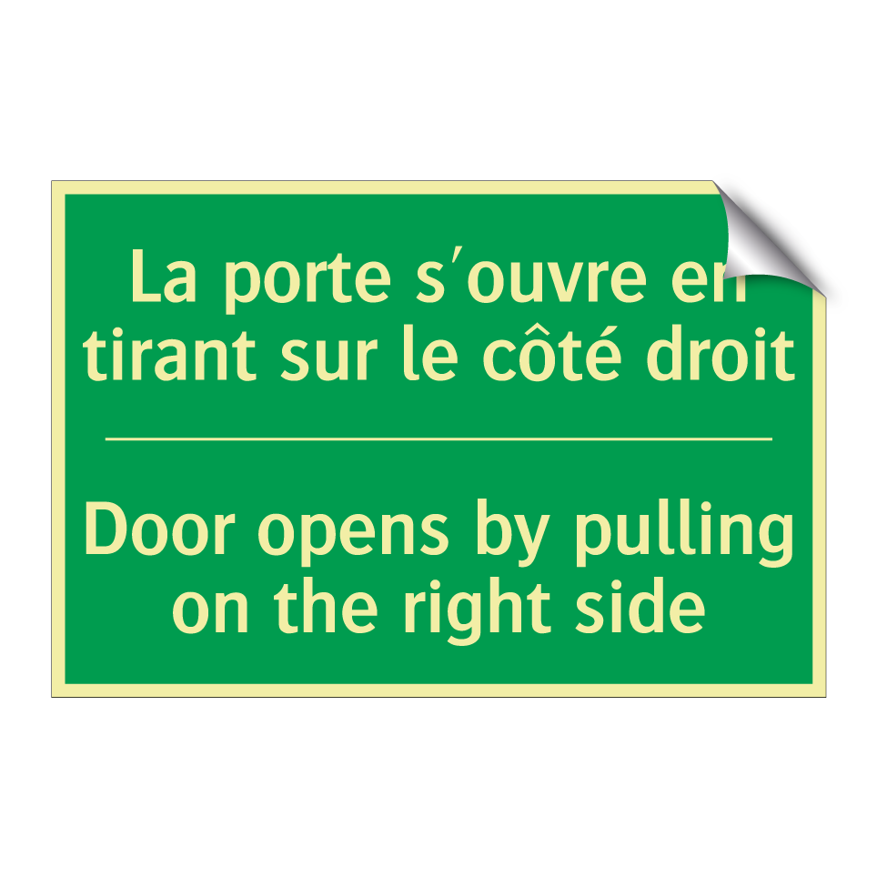 Panneau de secours bilingue avec texte en français : "La porte s'ouvre en tirant sur le côté droit", et en anglais : "Door opens by pulling on the right side"