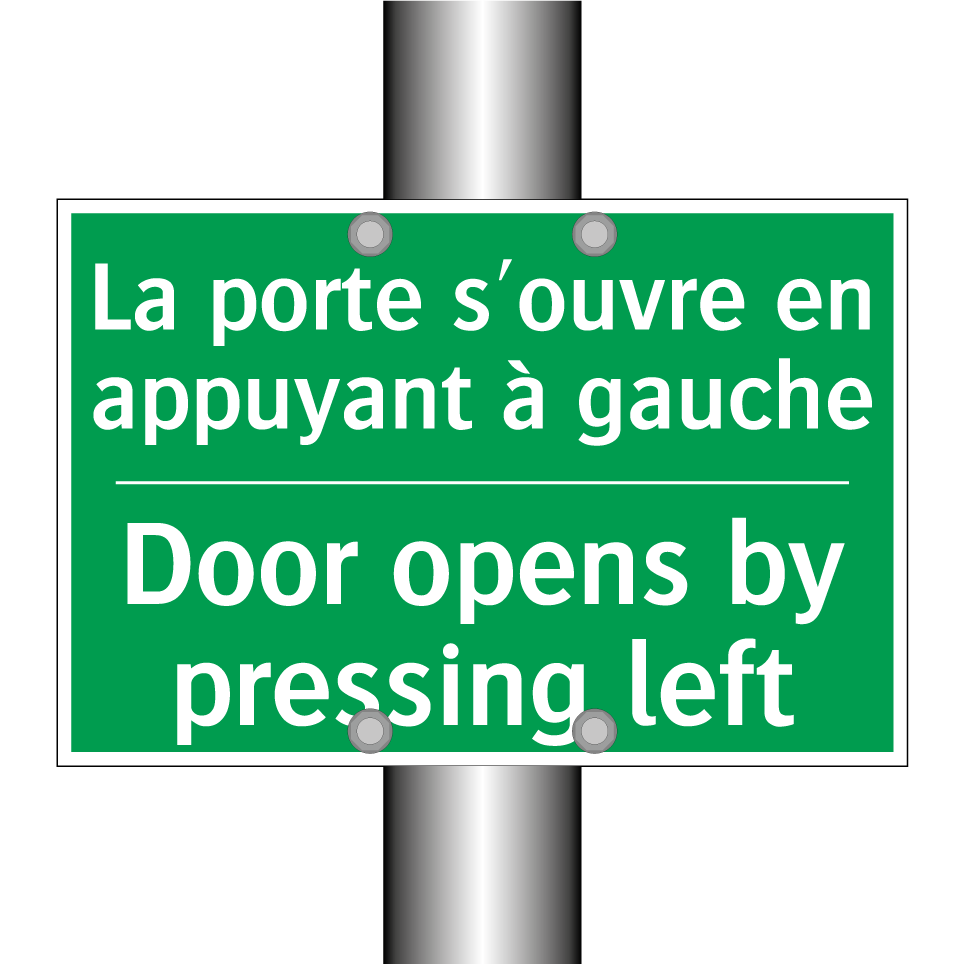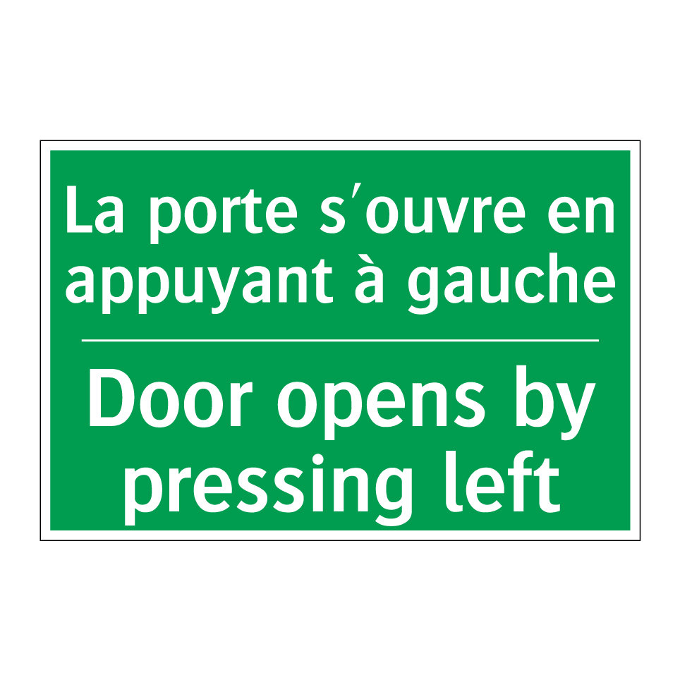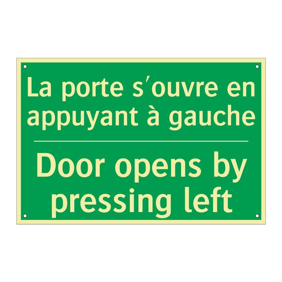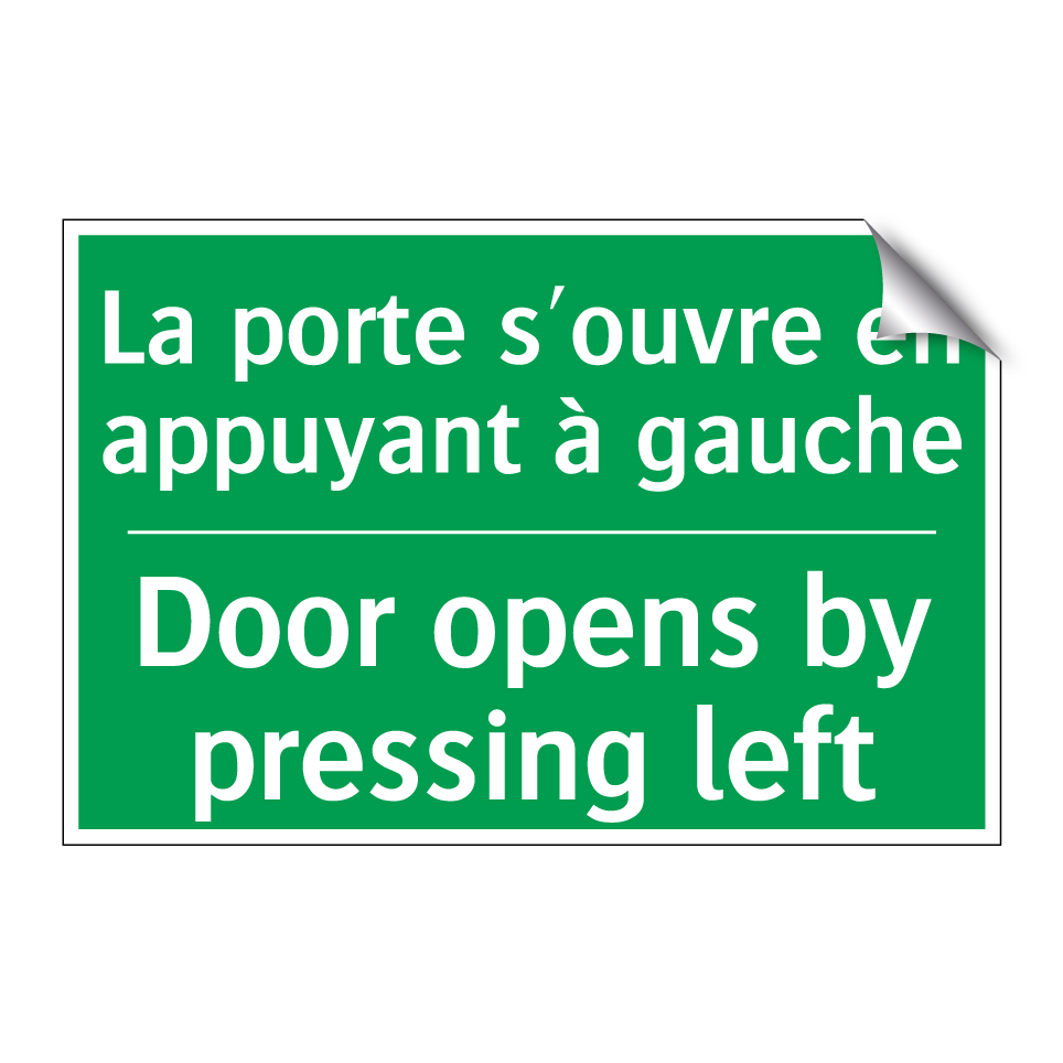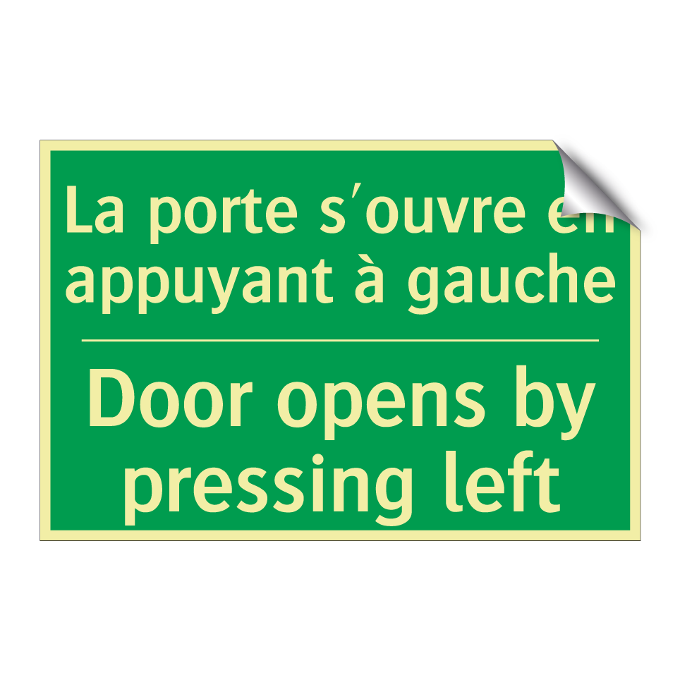 Panneau de secours bilingue avec texte en français : "La porte s'ouvre en appuyant à gauche", et en anglais : "Door opens by pressing left"