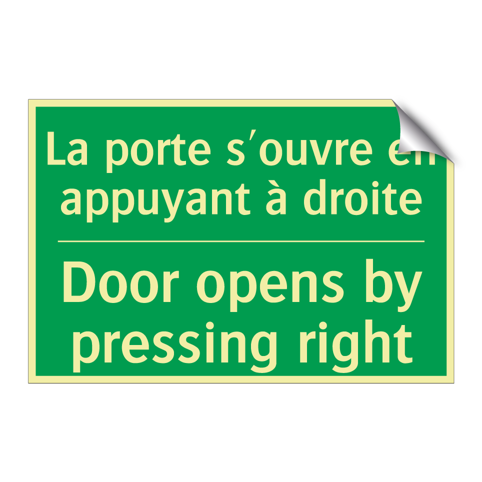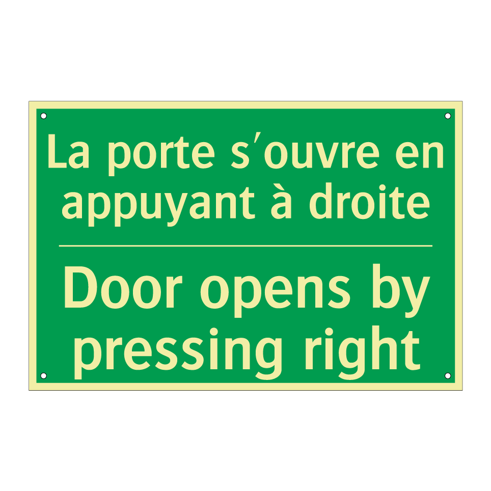 Panneau de secours bilingue avec texte en français : "La porte s'ouvre en appuyant à droite", et en anglais : "Door opens by pressing right"