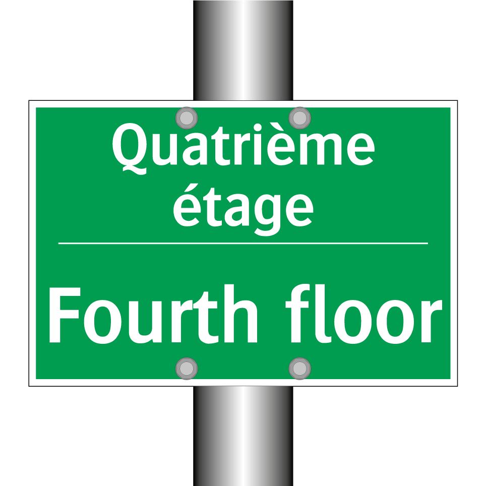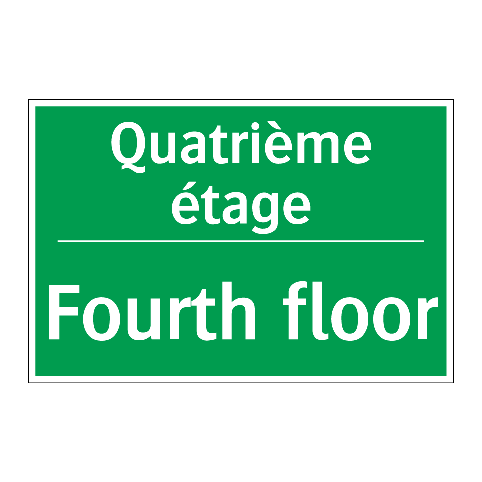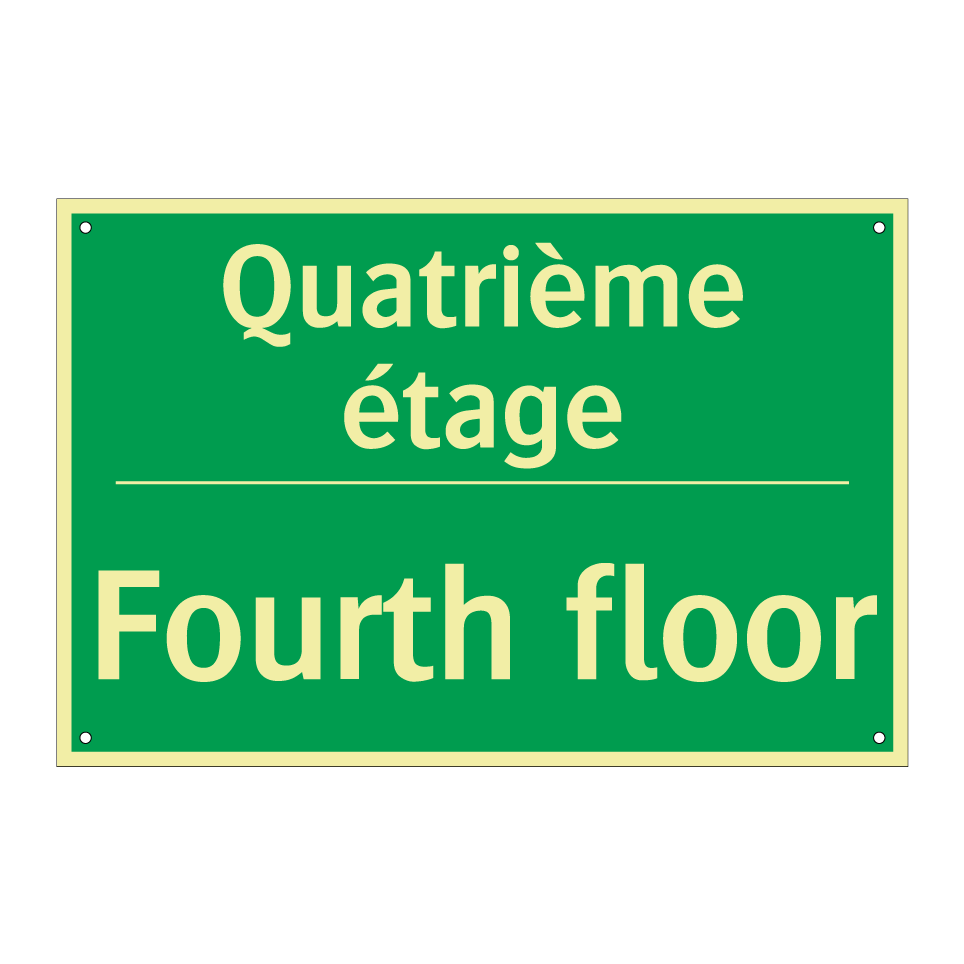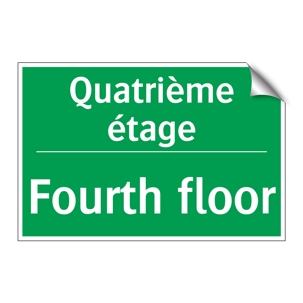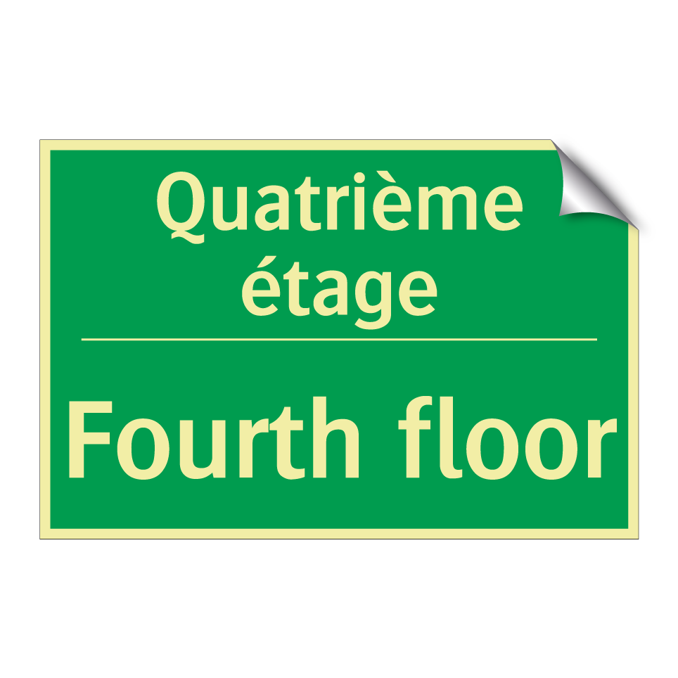 Panneau de secours bilingue avec texte en français : "Quatrième étage", et en anglais : "Fourth floor"