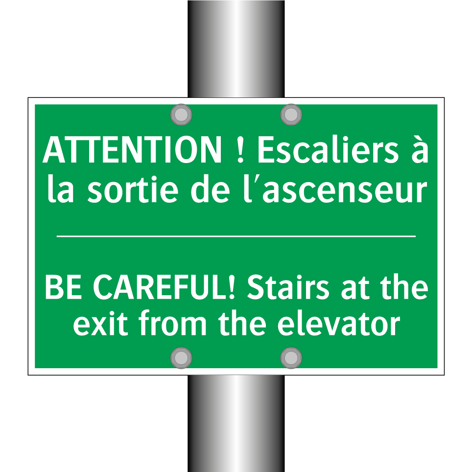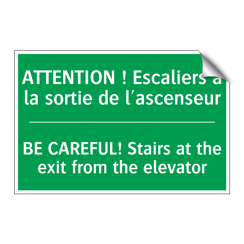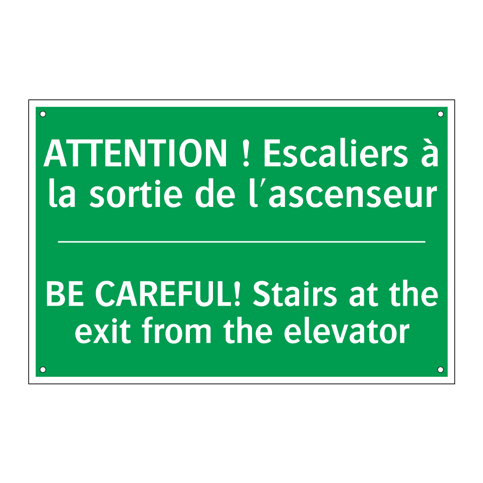 Panneau de secours bilingue avec texte en français : "ATTENTION ! Escaliers à la sortie de l'ascenseur", et en anglais : "BE CAREFUL! Stairs at the exit from the elevator"