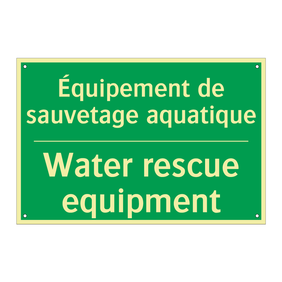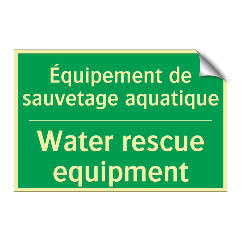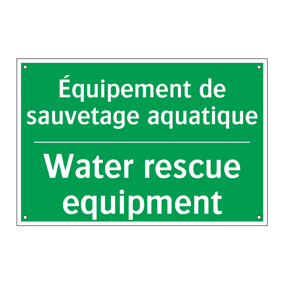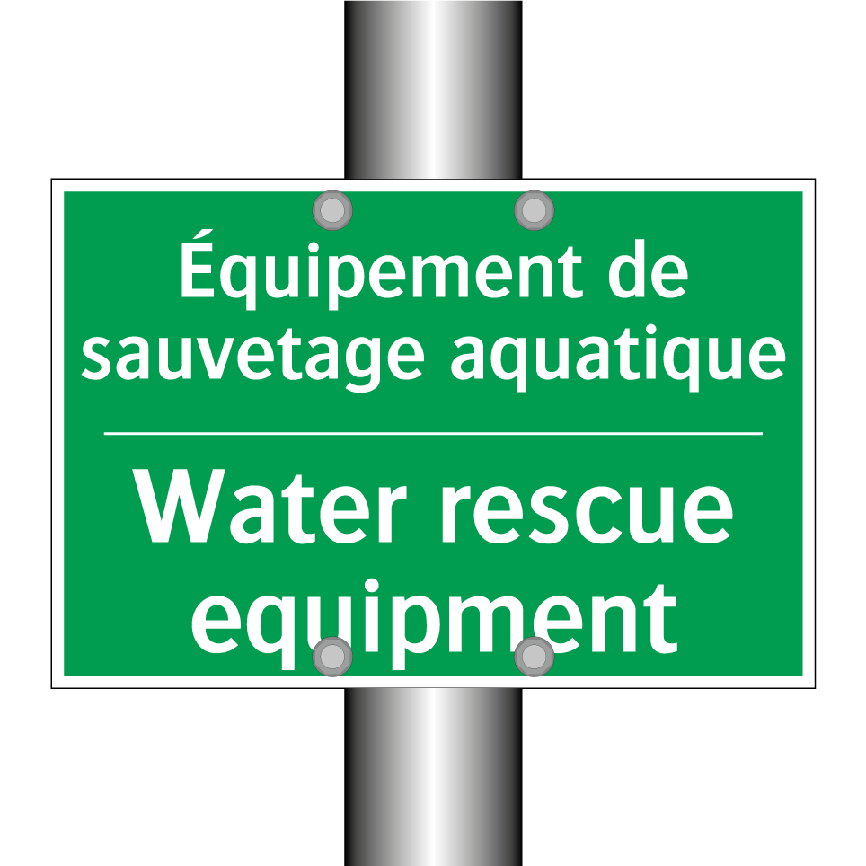 Panneau de secours bilingue avec texte en français : "Équipement de sauvetage aquatique", et en anglais : "Water rescue equipment"
