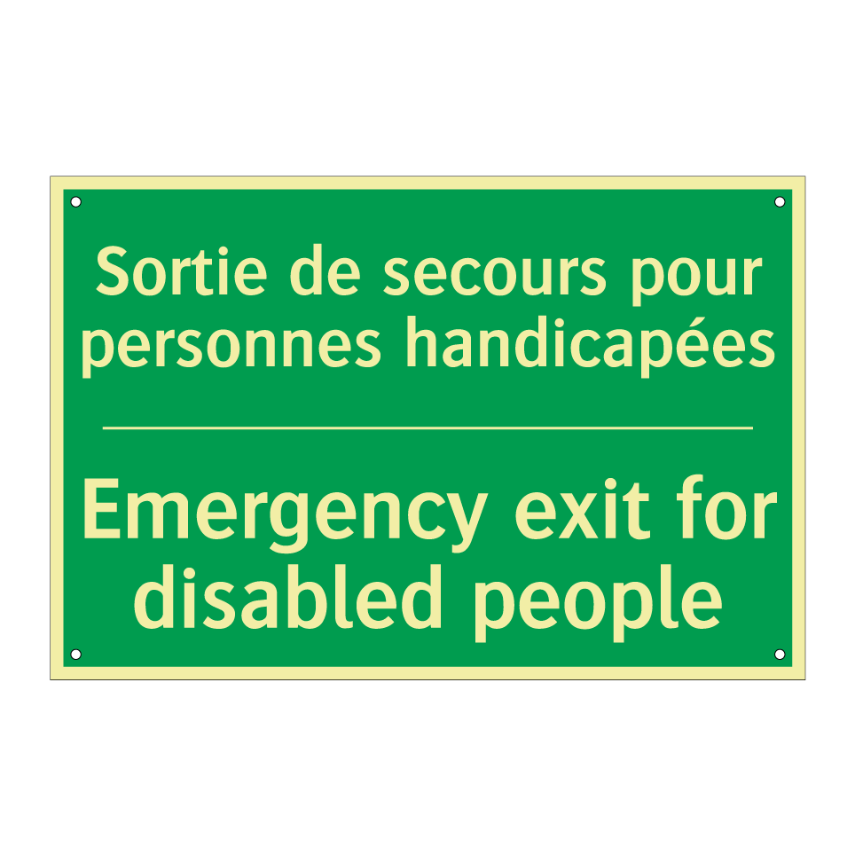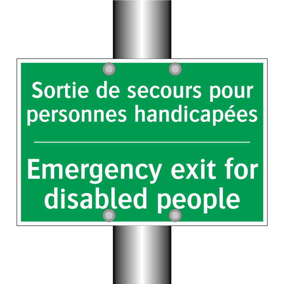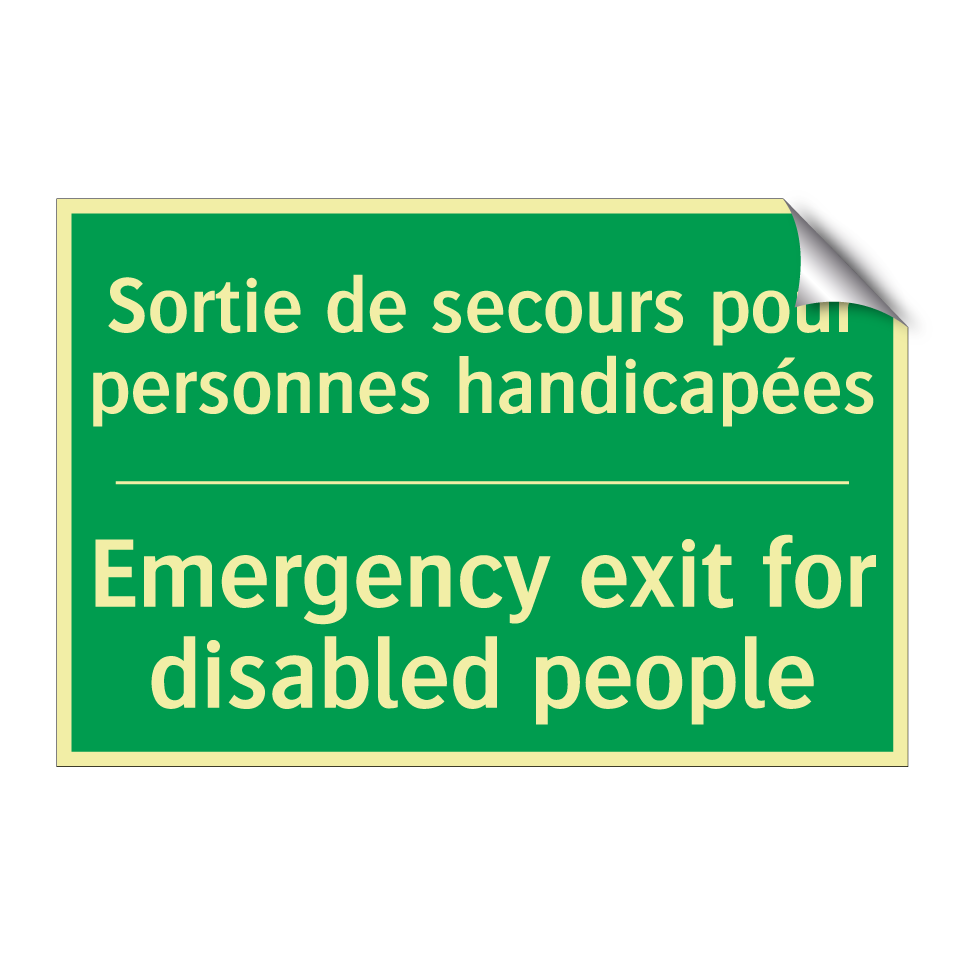 Panneau de secours bilingue avec texte en français : "Sortie de secours pour personnes handicapées", et en anglais : "Emergency exit for disabled people"