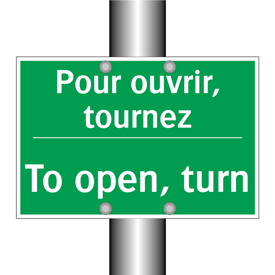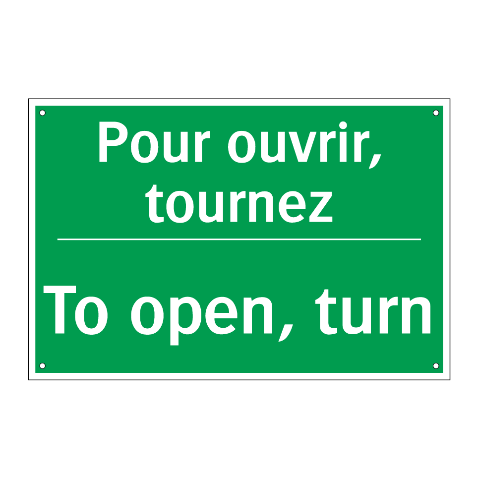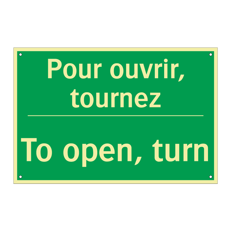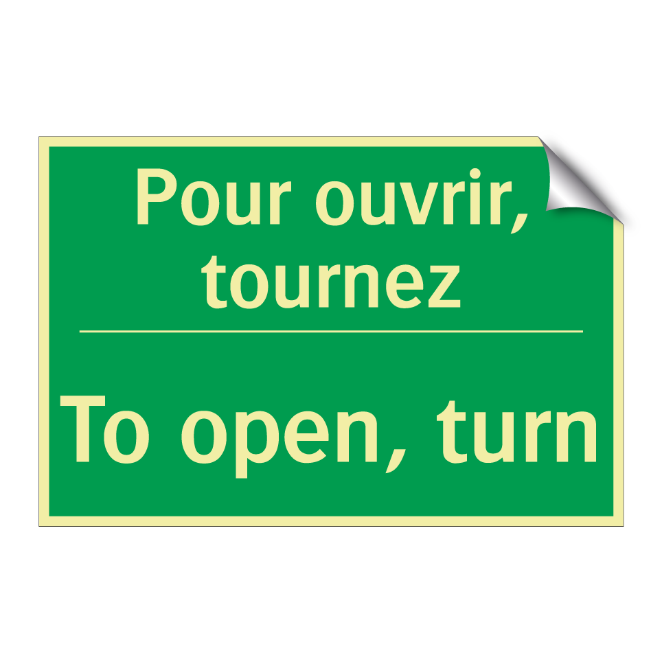Panneau de secours bilingue avec texte en français : "Pour ouvrir, tournez", et en anglais : "To open, turn"