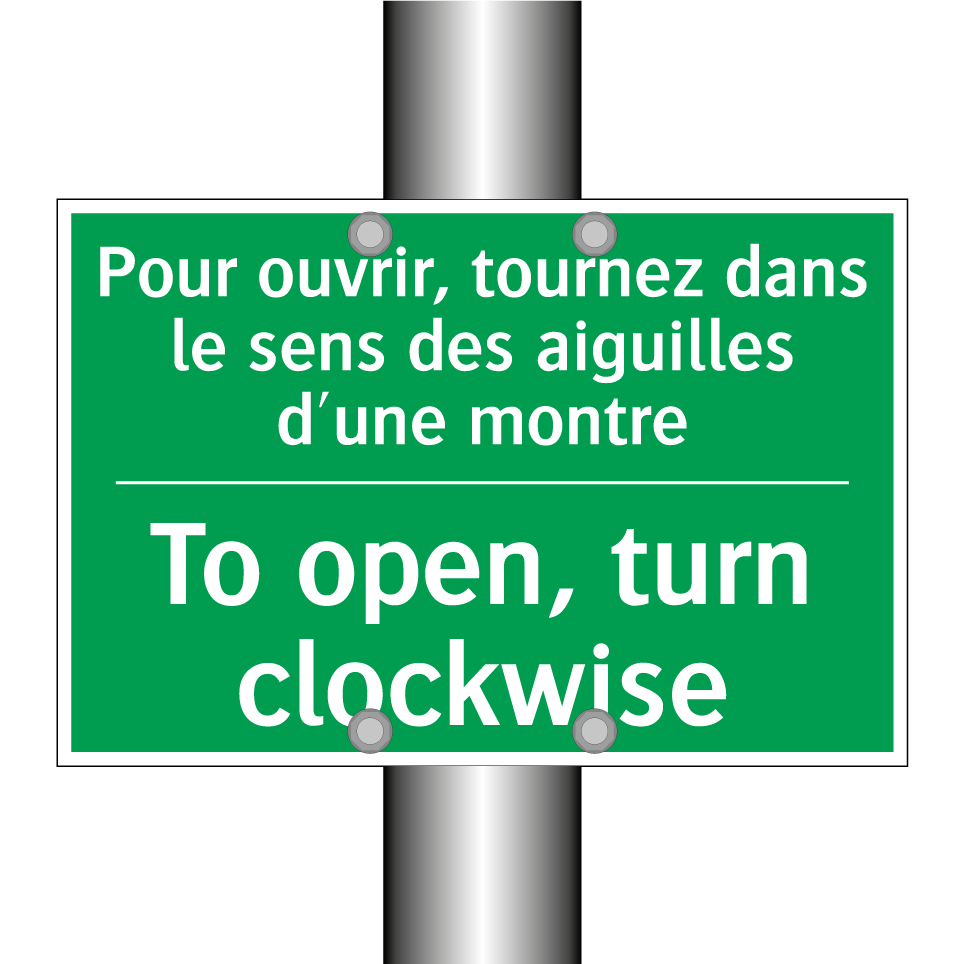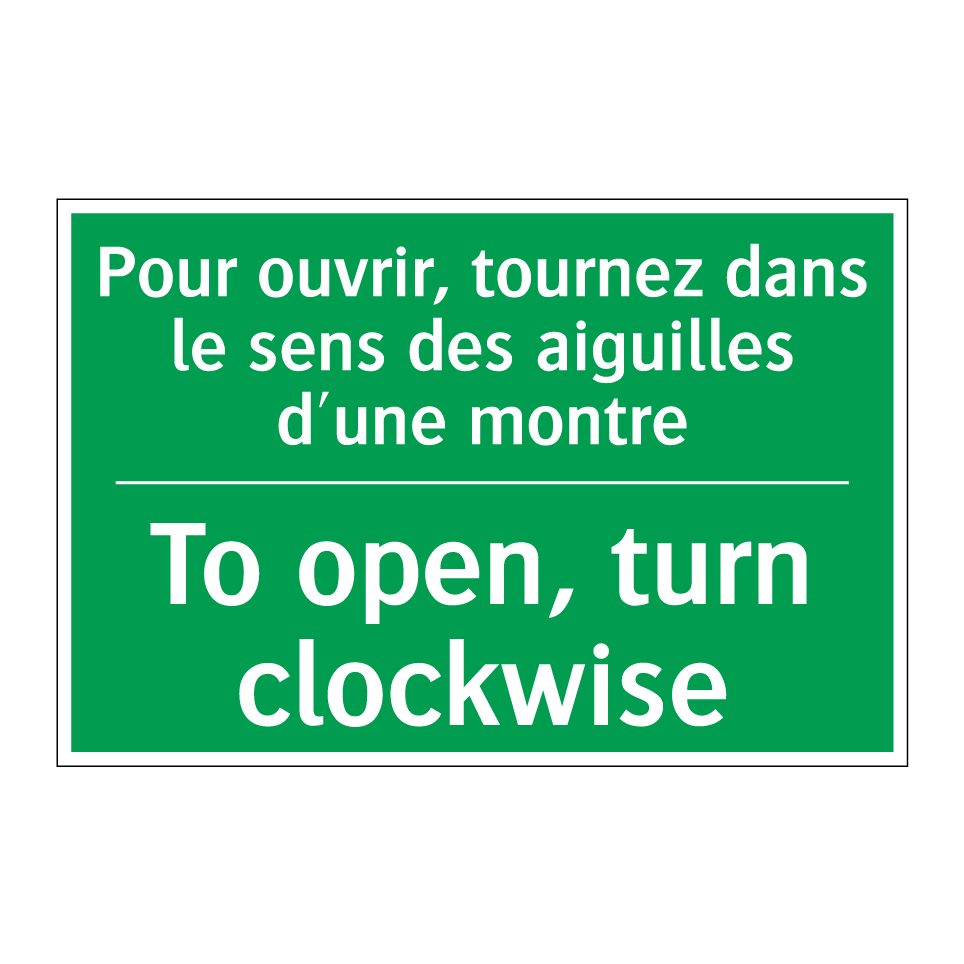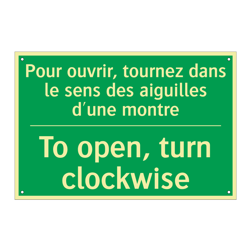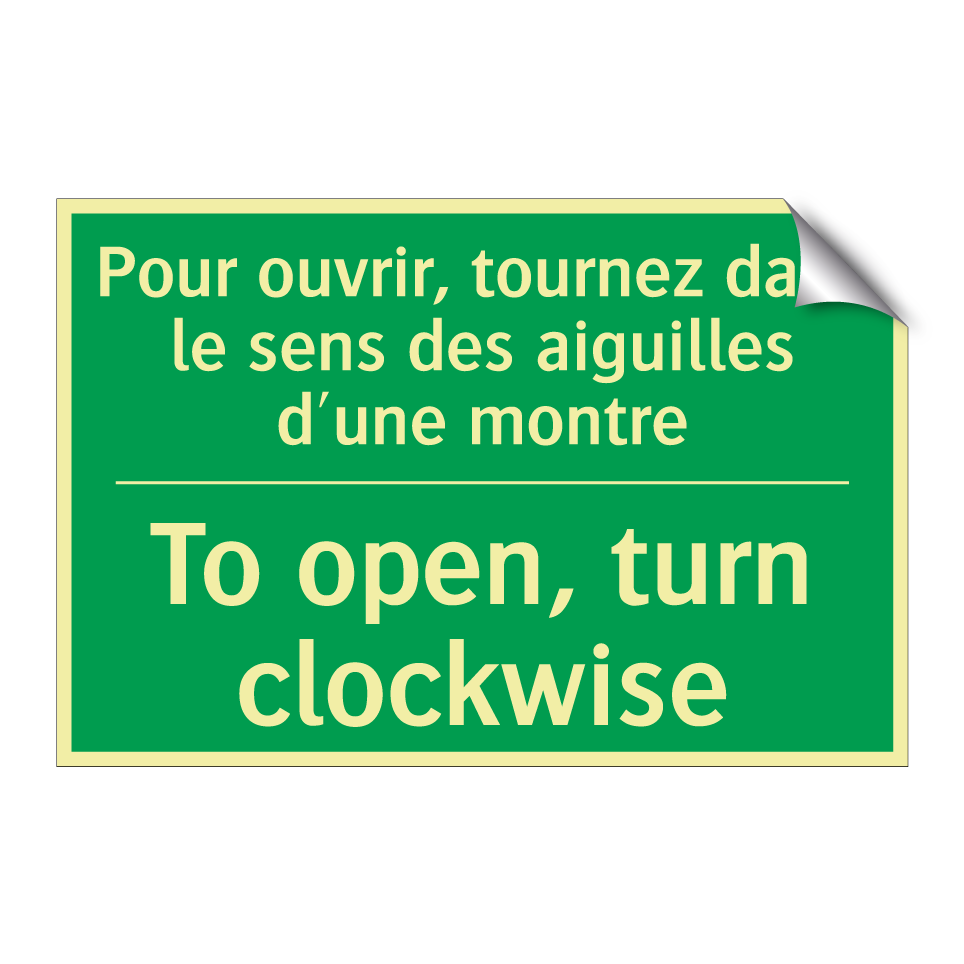 Panneau de secours bilingue avec texte en français : "Pour ouvrir, tournez dans le sens des aiguilles d'une montre", et en anglais : "To open, turn clockwise"
