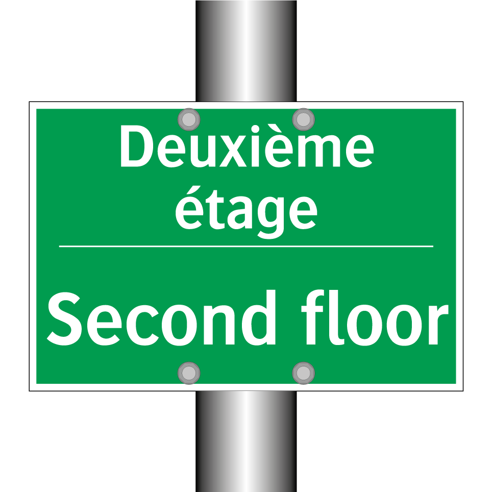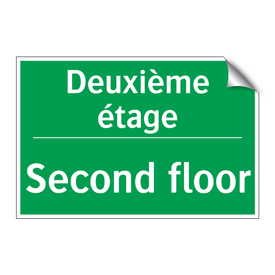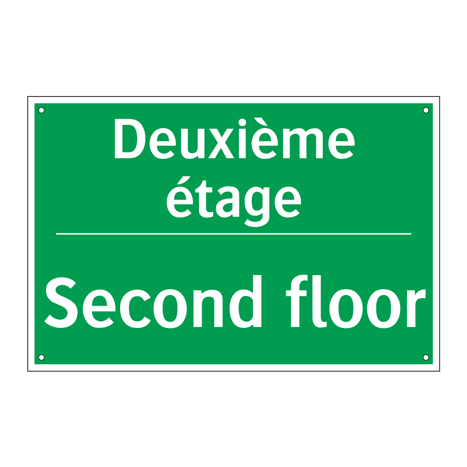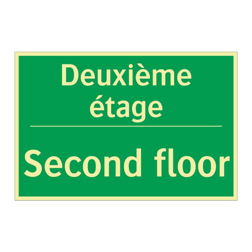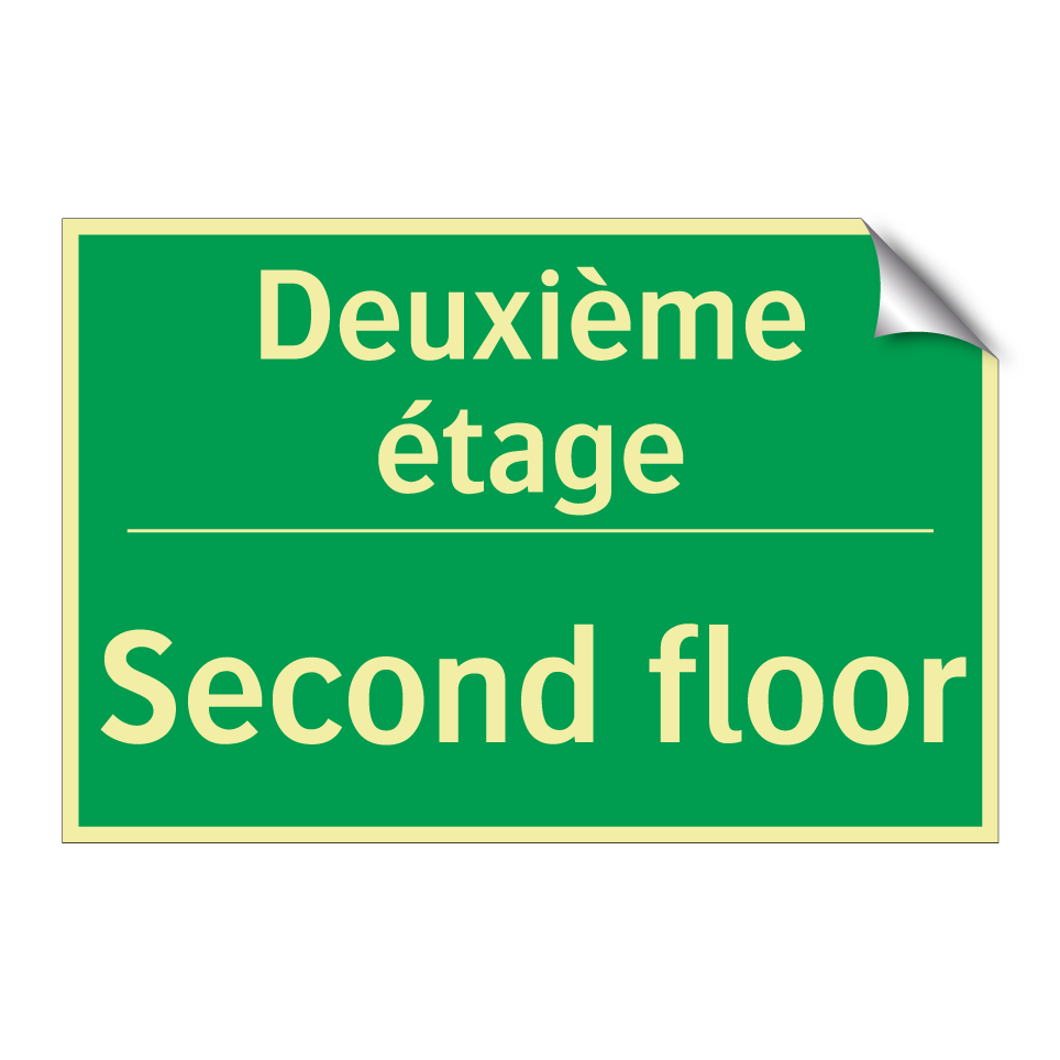 Panneau de secours bilingue avec texte en français : "Deuxième étage", et en anglais : "Second floor"