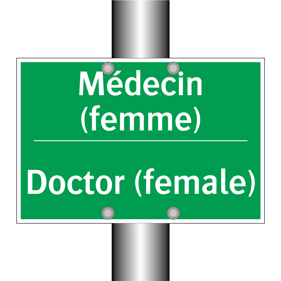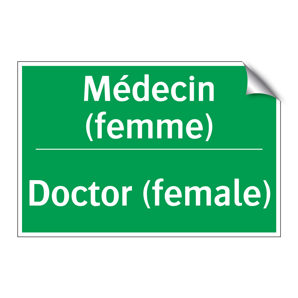 Panneau de secours bilingue avec texte en français : "Médecin (femme)", et en anglais : "Doctor (female)"