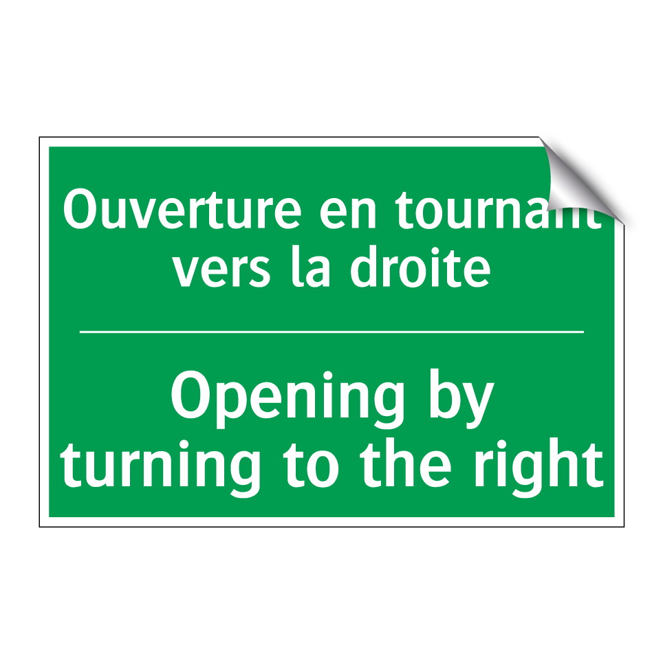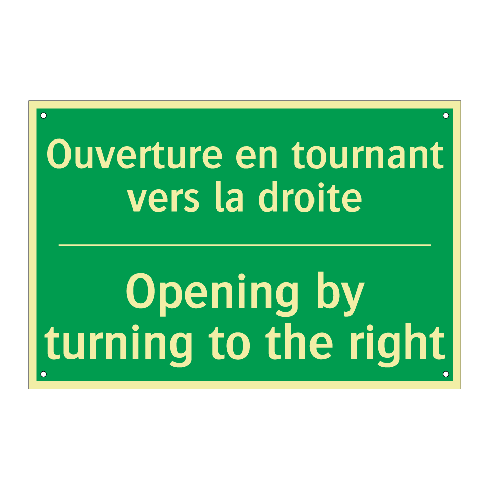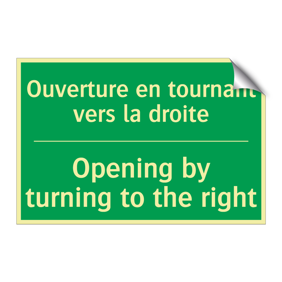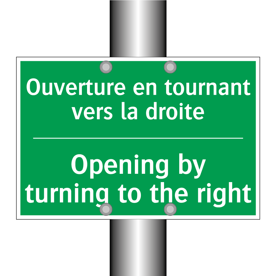 Panneau de secours bilingue avec texte en français : "Ouverture en tournant vers la droite", et en anglais : "Opening by turning to the right"