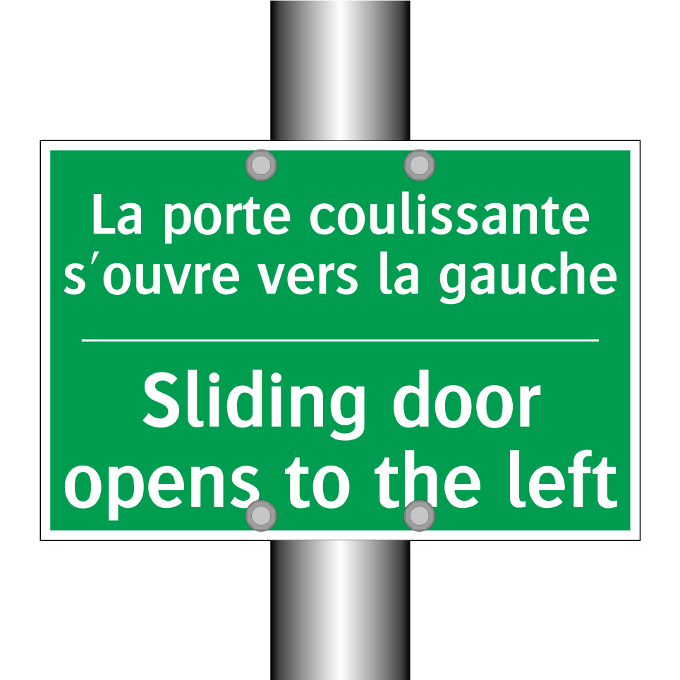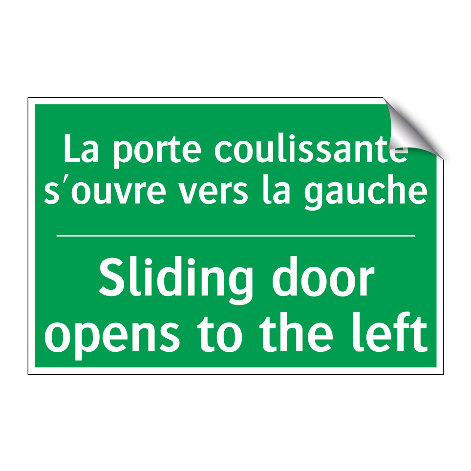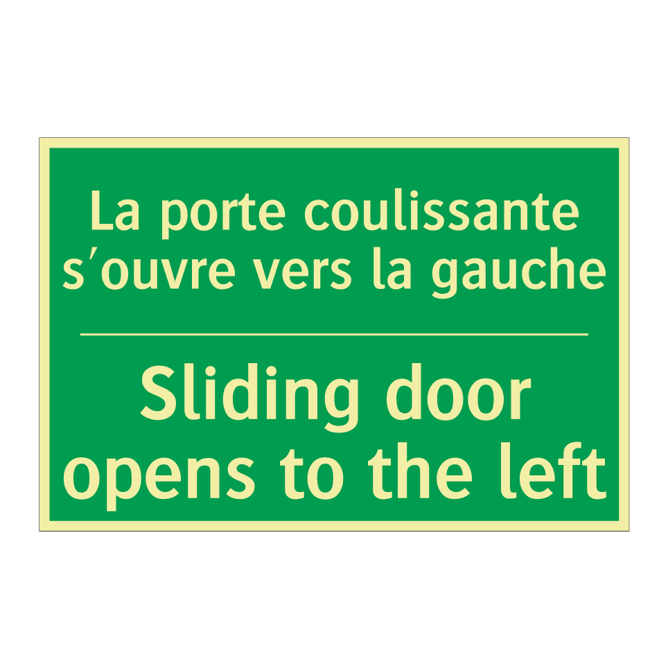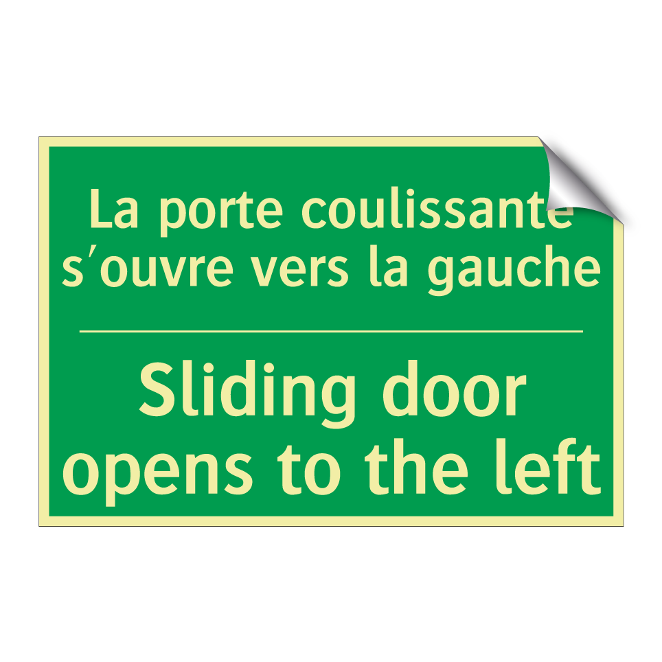 Panneau de secours bilingue avec texte en français : "La porte coulissante s'ouvre vers la gauche", et en anglais : "Sliding door opens to the left"