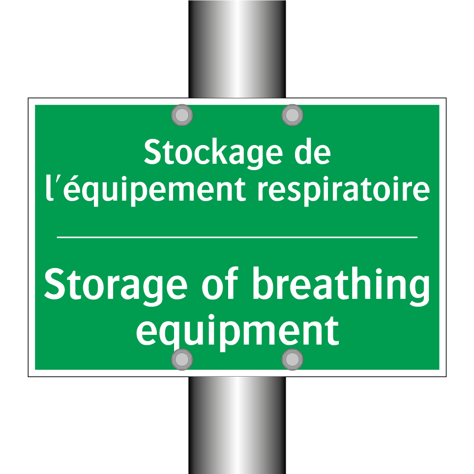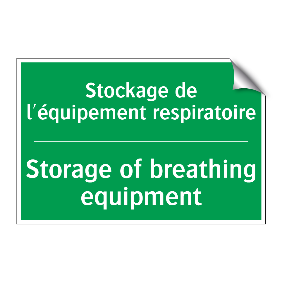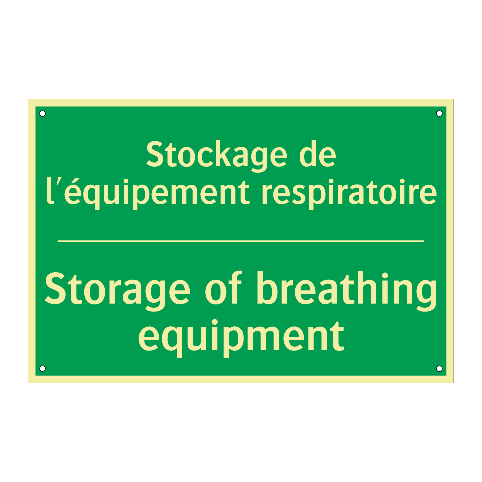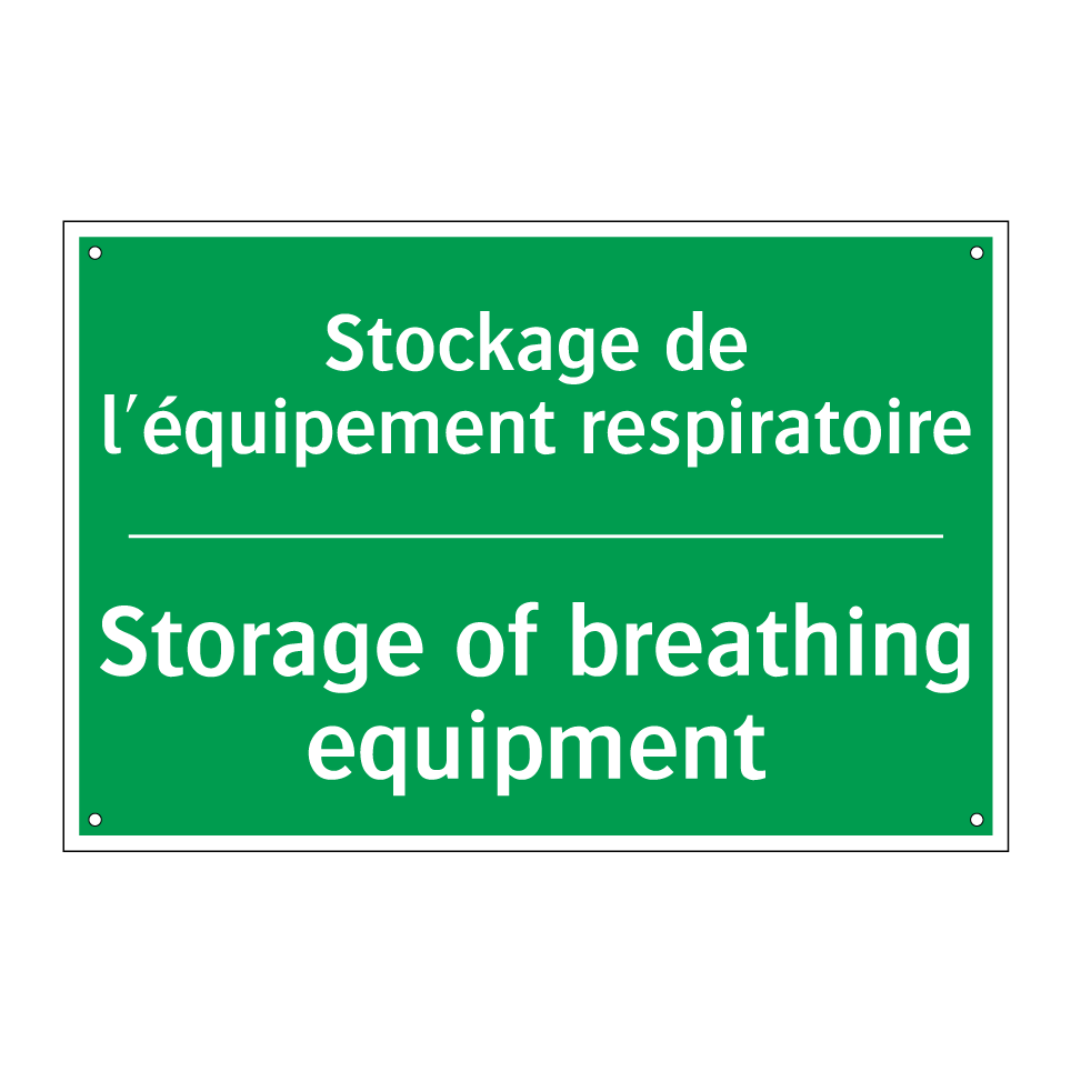 Panneau de secours bilingue avec texte en français : "Stockage de l'équipement respiratoire", et en anglais : "Storage of breathing equipment"