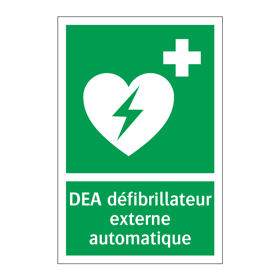 Panneau de secours avec le texte DEA défibrillateur externe automatique et une symbolique claire