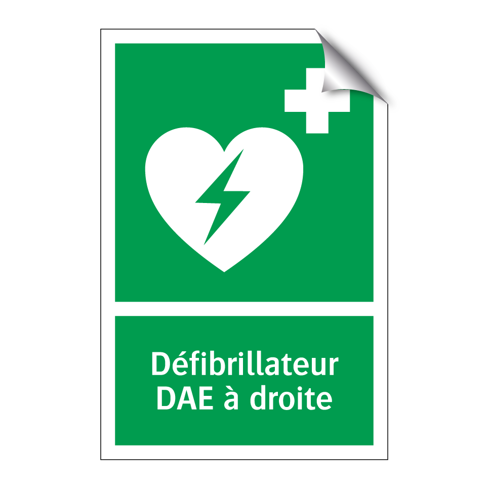 Panneau de secours avec le texte Défibrillateur DAE à droite et une symbolique claire