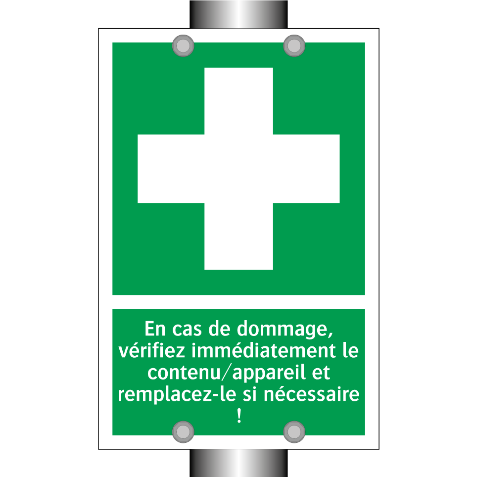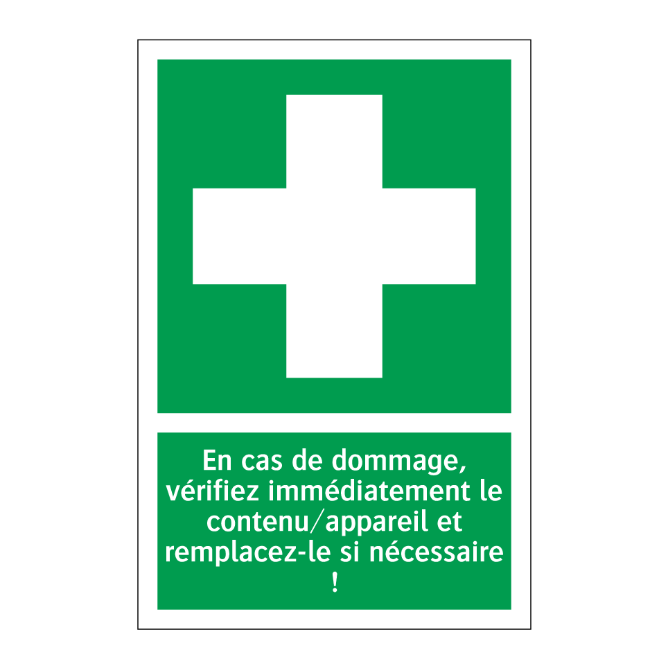 Panneau de secours avec le texte En cas de dommage, vérifiez immédiatement le contenu/appareil et remplacez-le si nécessaire ! et une symbolique claire