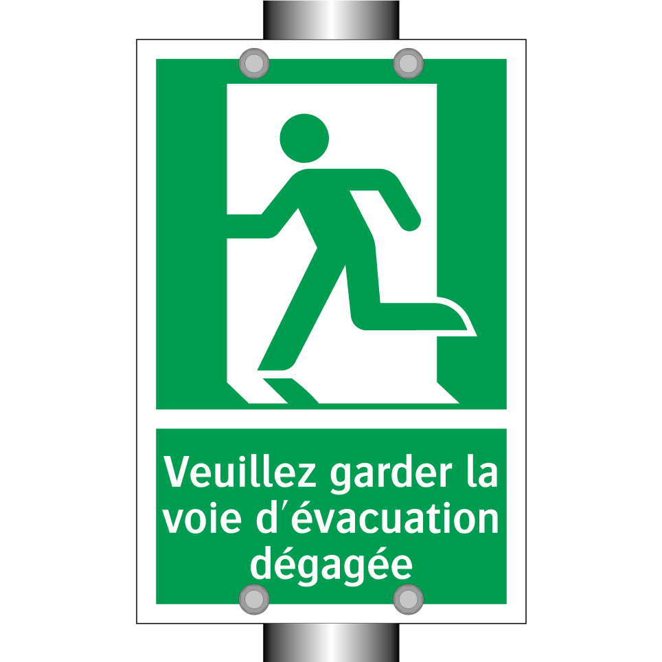Panneau de secours avec le texte Veuillez garder la voie d'évacuation dégagée et une symbolique claire