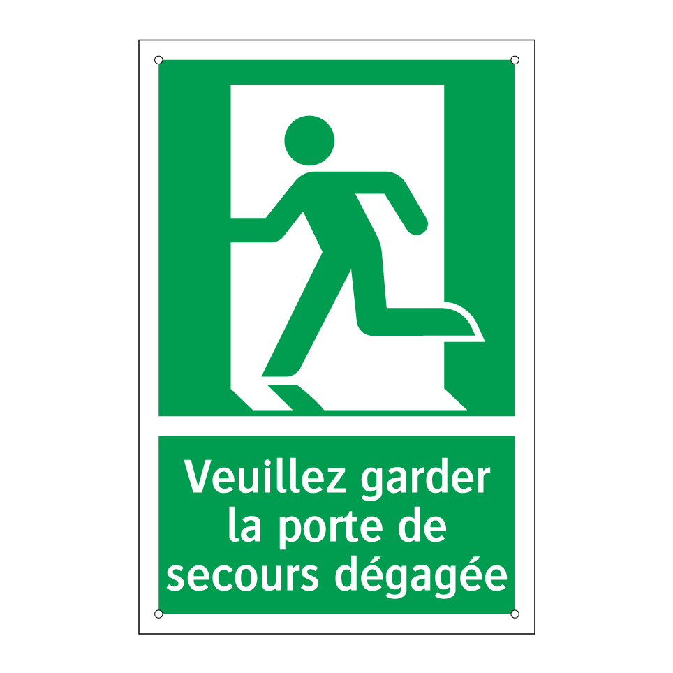 Panneau de secours avec le texte Veuillez garder la porte de secours dégagée et une symbolique claire