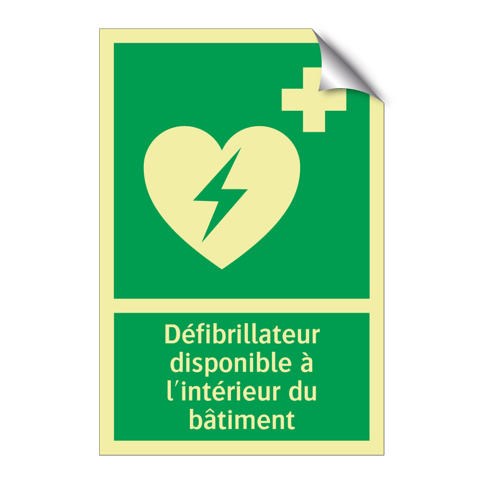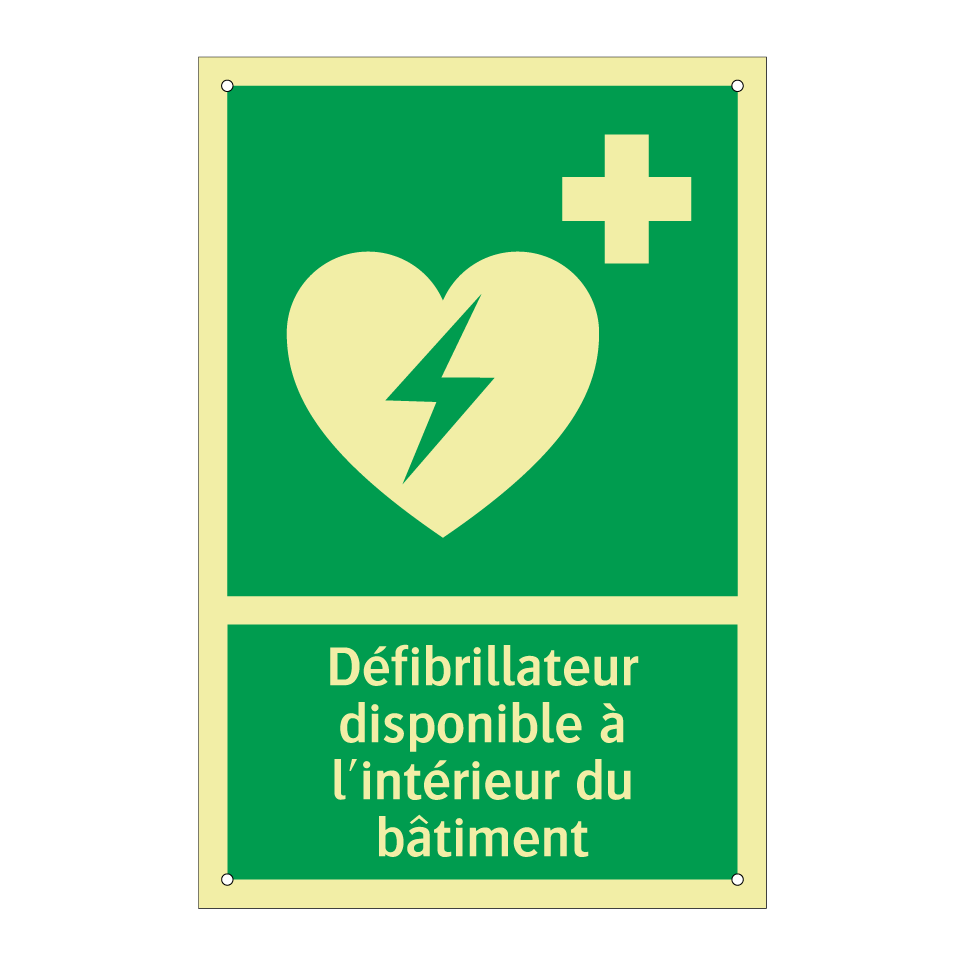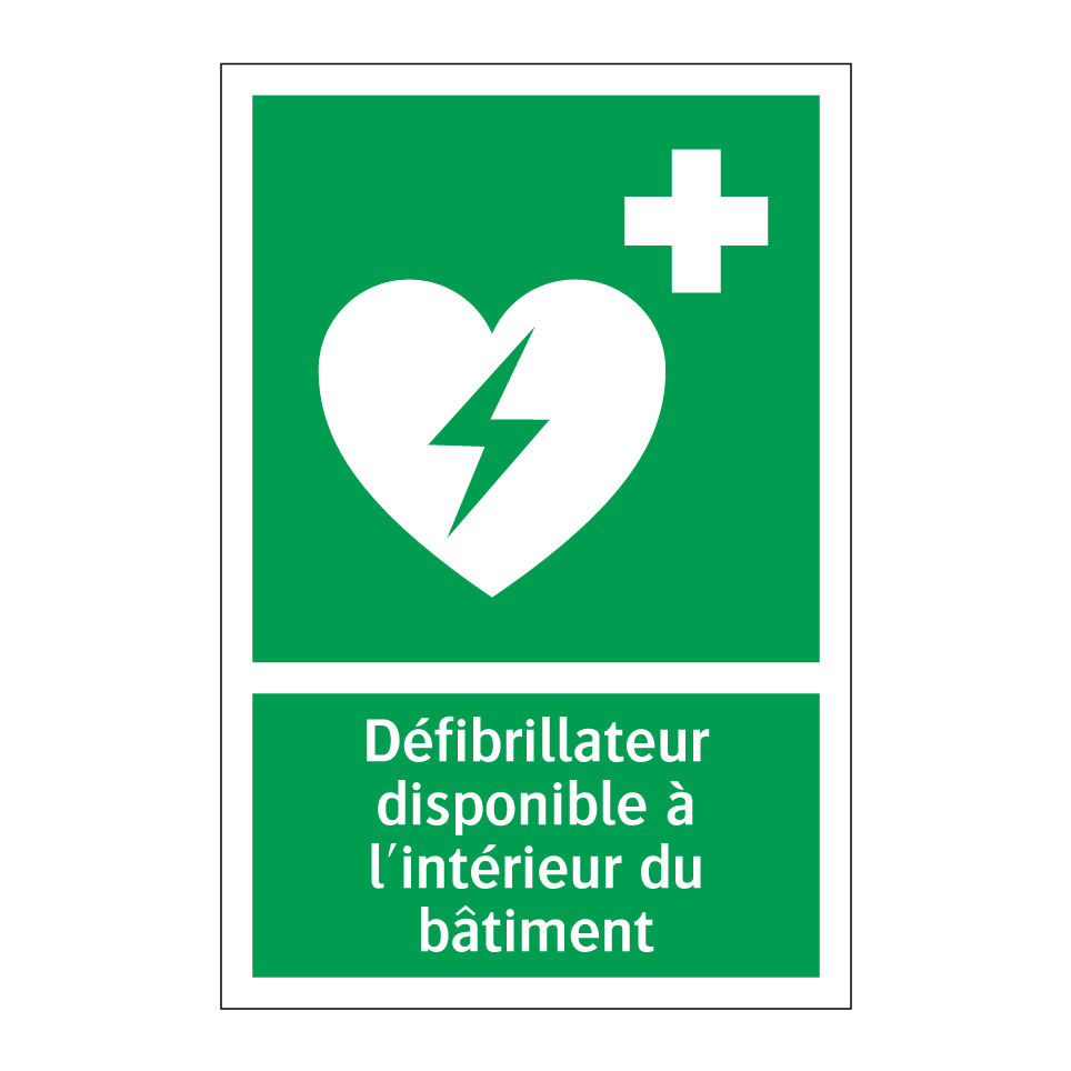 Panneau de secours avec le texte Défibrillateur disponible à l'intérieur du bâtiment et une symbolique claire