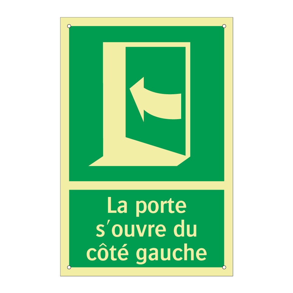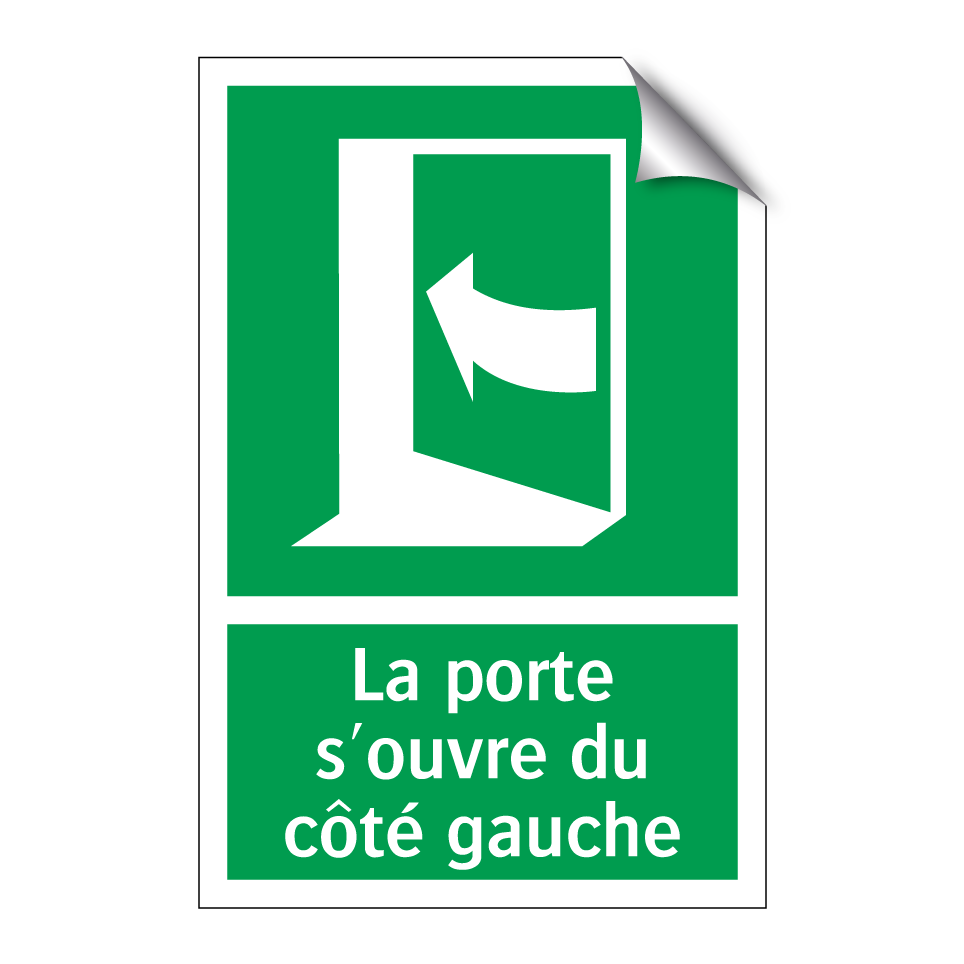 Panneau de secours avec le texte La porte s'ouvre du côté gauche et une symbolique claire