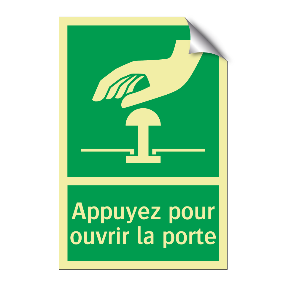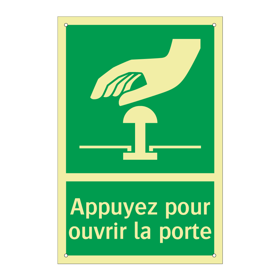 Panneau de secours avec le texte Appuyez pour ouvrir la porte et une symbolique claire