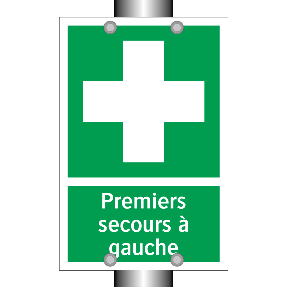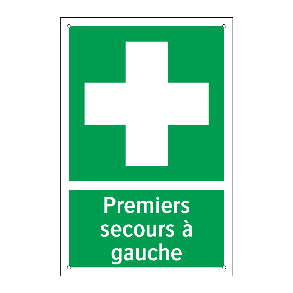Panneau de secours avec le texte Premiers secours à gauche et une symbolique claire