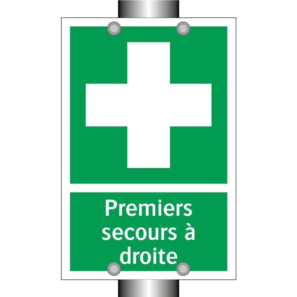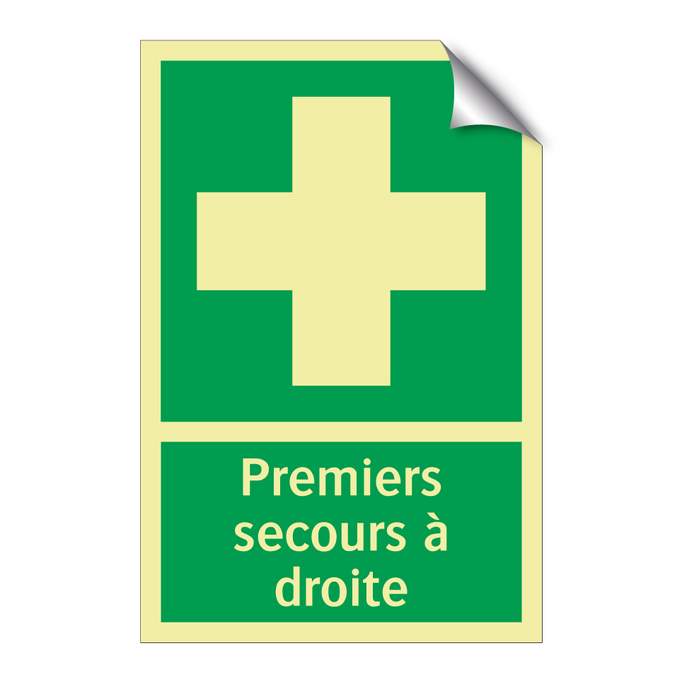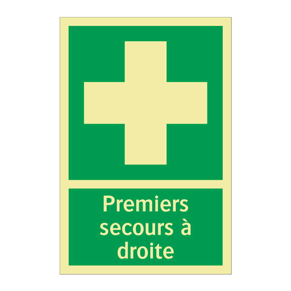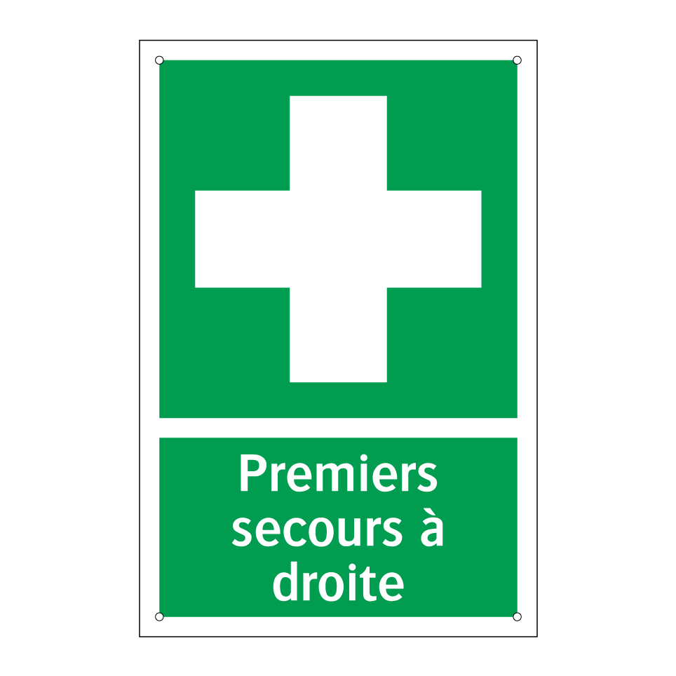 Panneau de secours avec le texte Premiers secours à droite et une symbolique claire
