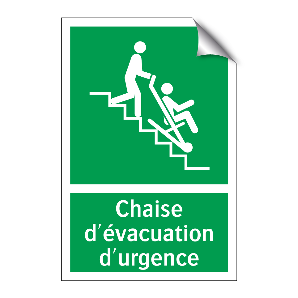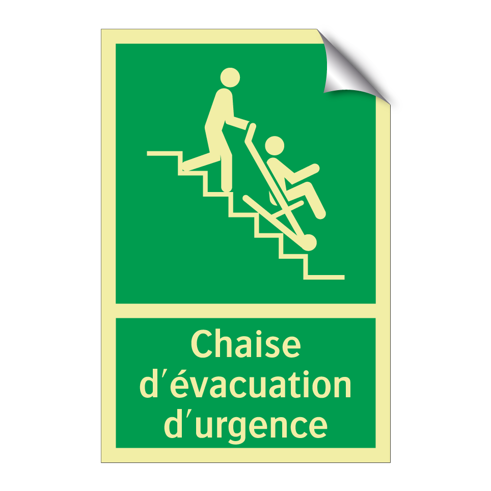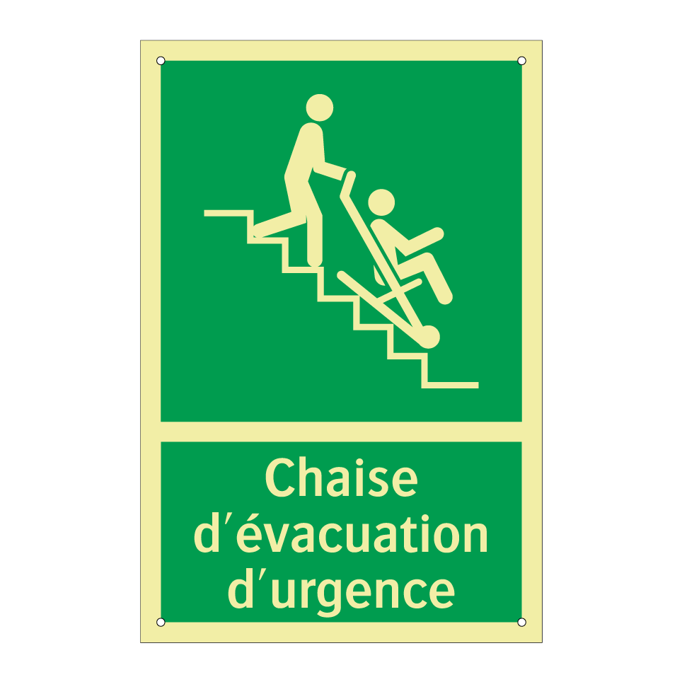 Panneau de secours avec le texte Chaise d'évacuation d'urgence et une symbolique claire