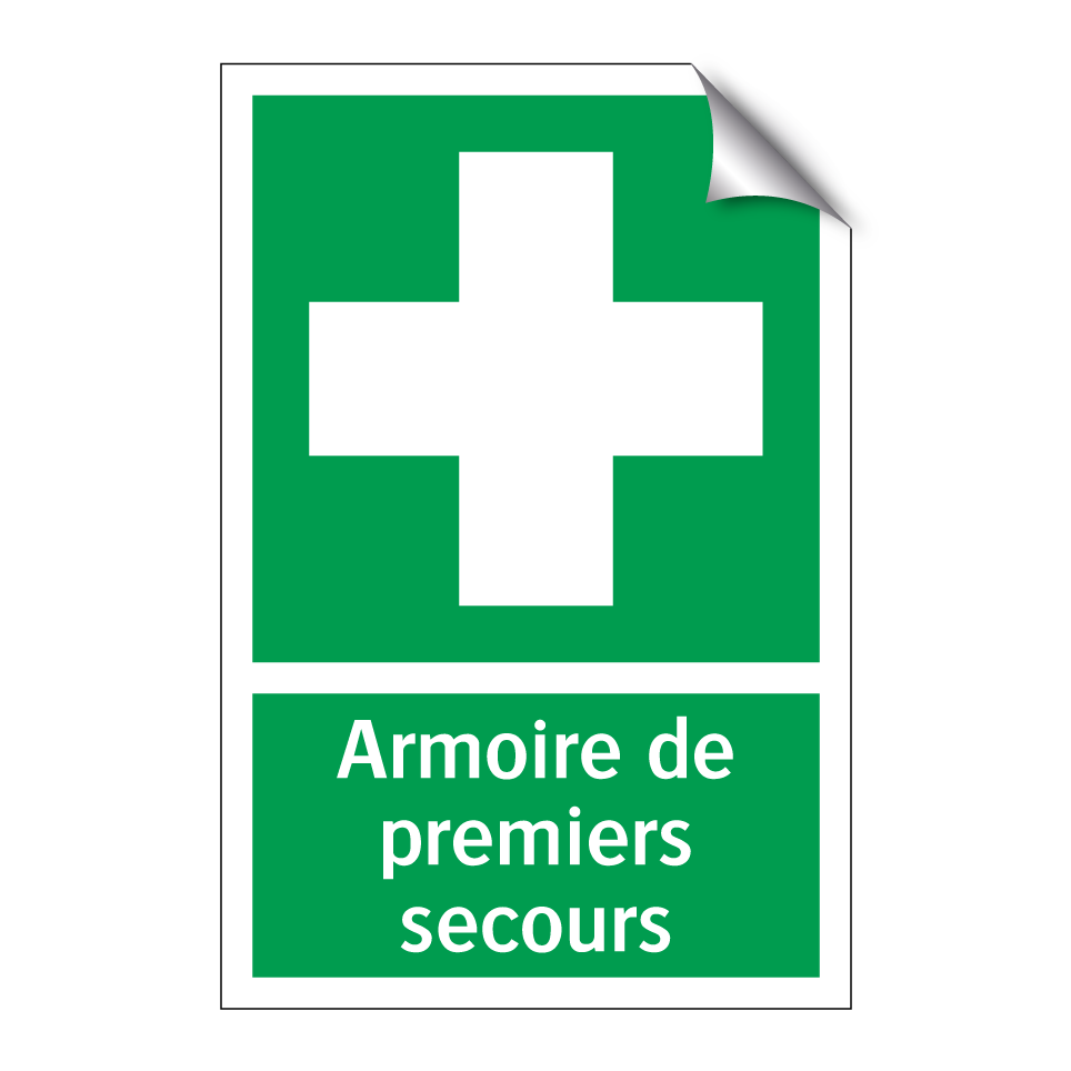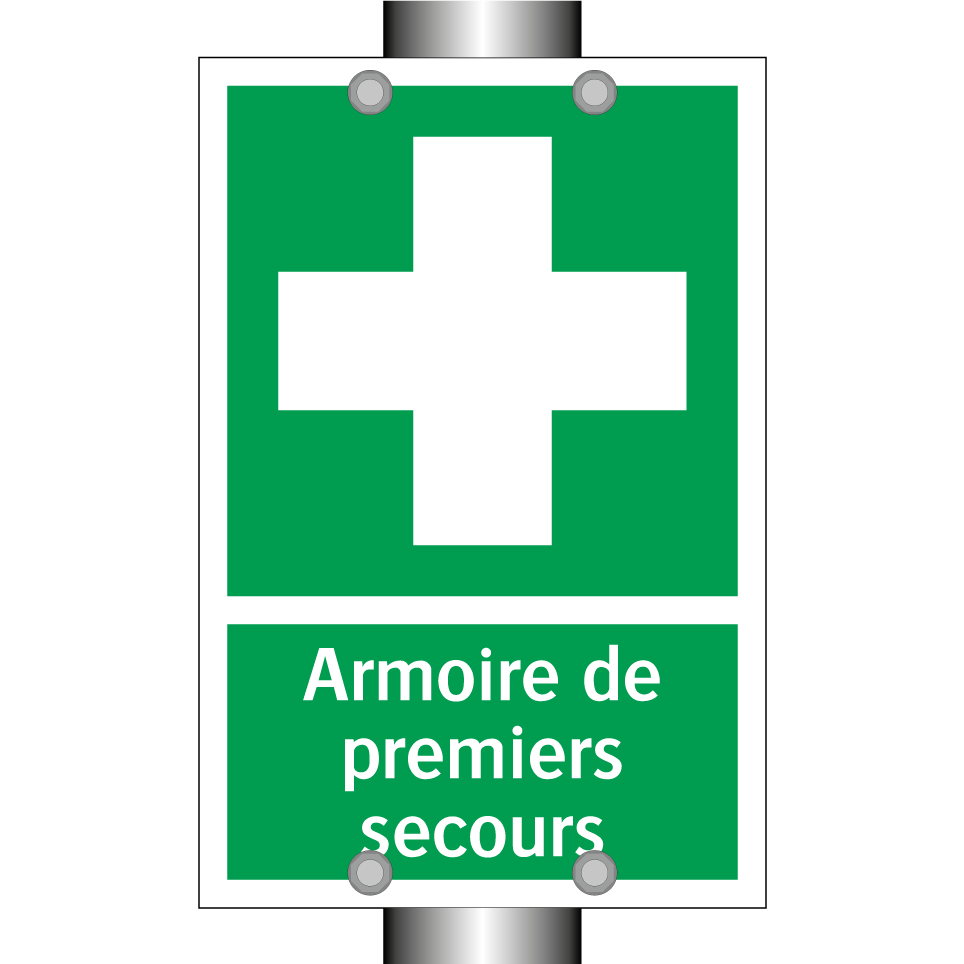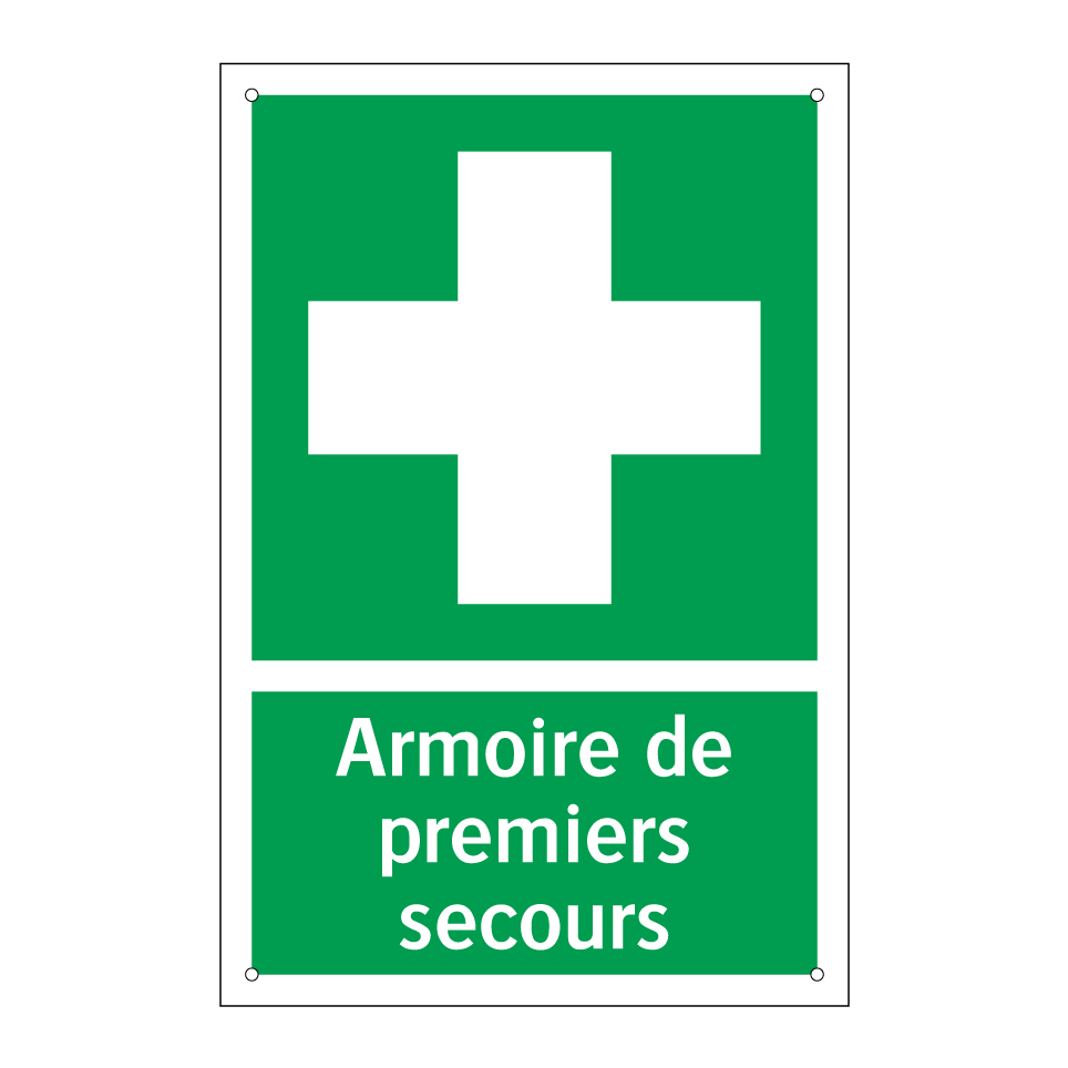 Panneau de secours avec le texte Armoire de premiers secours et une symbolique claire