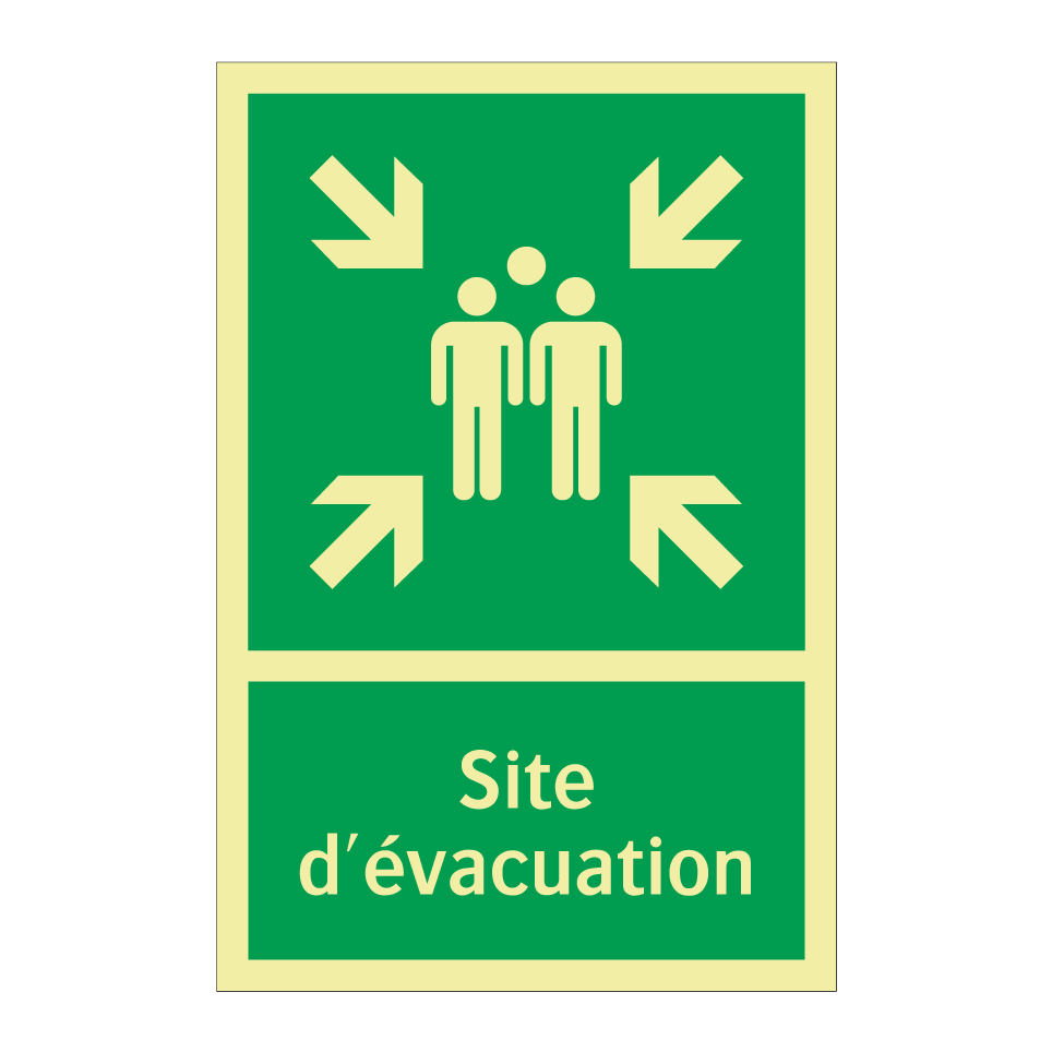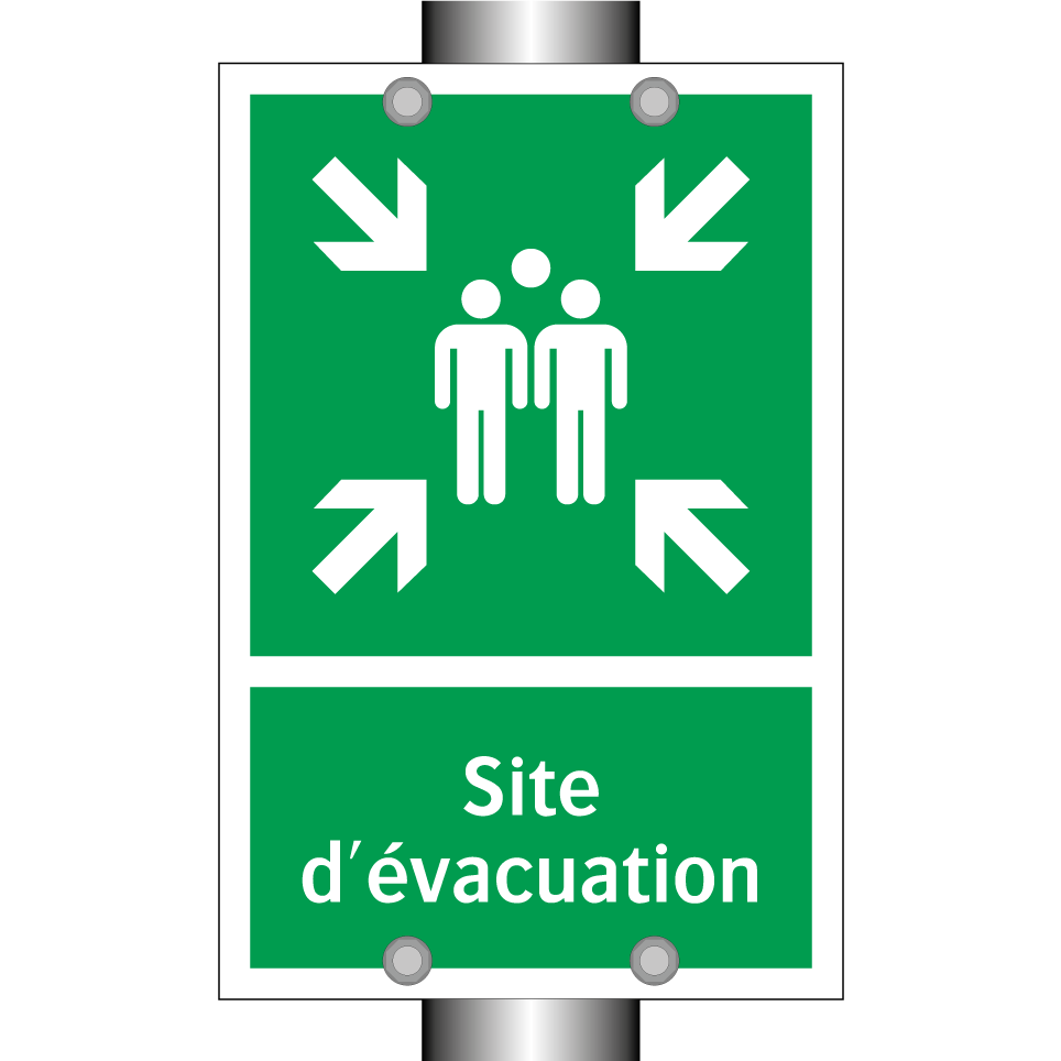 Panneau de secours avec le texte Site d'évacuation et une symbolique claire