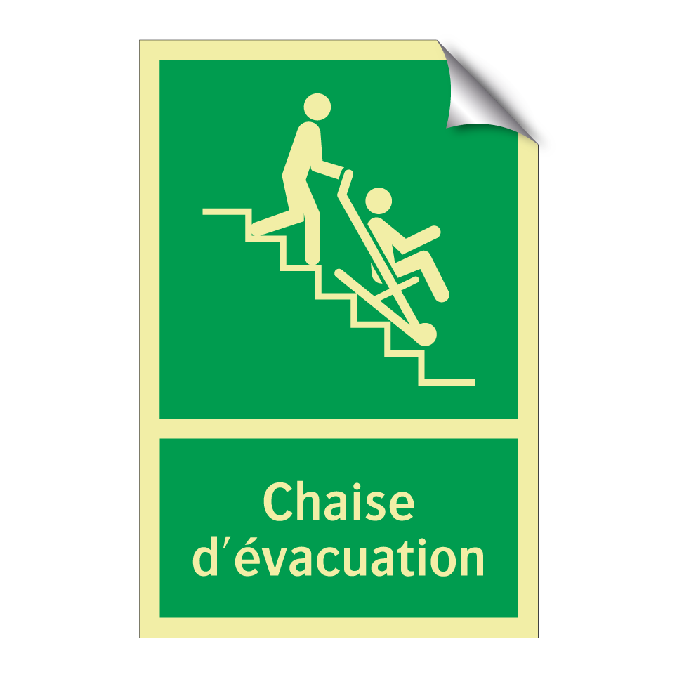 Panneau de secours avec le texte Chaise d'évacuation et une symbolique claire