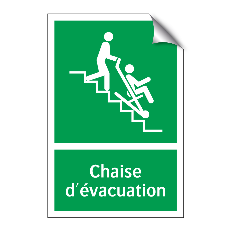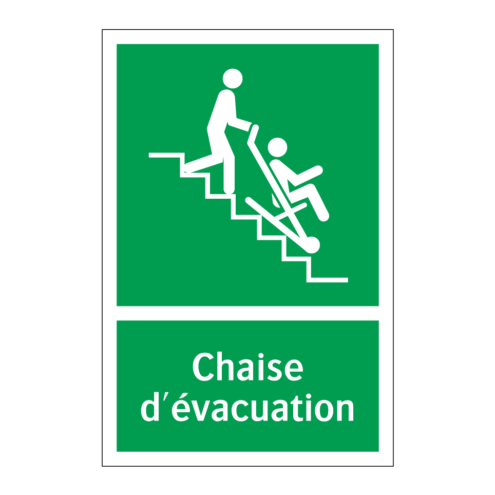 Cette pancarte d'évacuation est essentielle pour garantir la sécurité dans les bâtiments publics et privés. Elle est idéale pour être placée près des escaliers, des sorties de secours ou des zones de rassemblement, indiquant clairement l'emplacement des chaises d'évacuation en cas d'urgence. Grâce à son fond vert et son texte blanc, elle assure une visibilité optimale même dans des conditions de faible luminosité. Utilisée dans les hôpitaux, les écoles et les bureaux, cette signalisation contribue à une évacuation rapide et ordonnée, renforçant ainsi la sécurité des occupants.