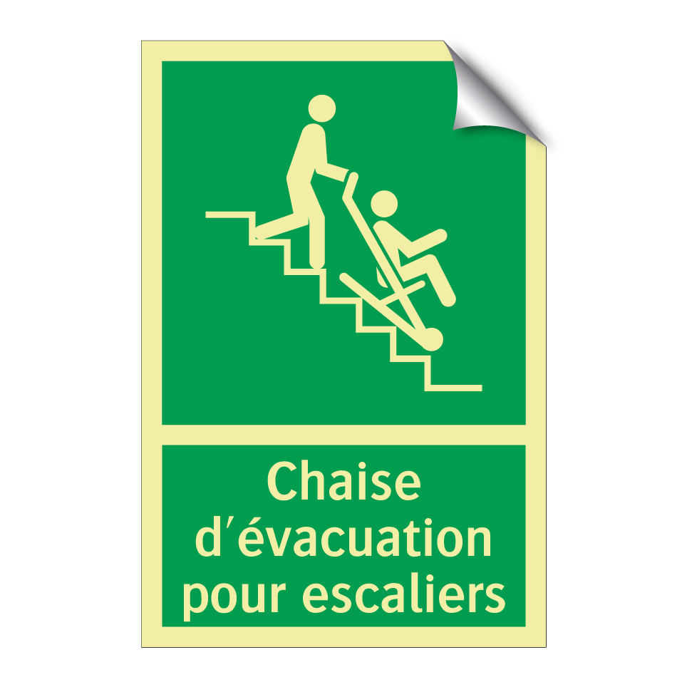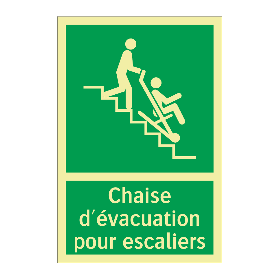 Panneau de secours avec le texte Chaise d'évacuation pour escaliers et une symbolique claire