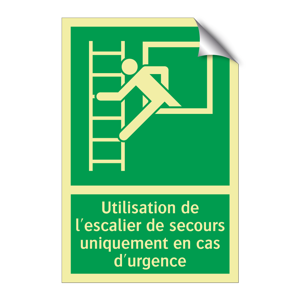 Panneau de secours avec le texte Utilisation de l'escalier de secours uniquement en cas d'urgence et une symbolique claire