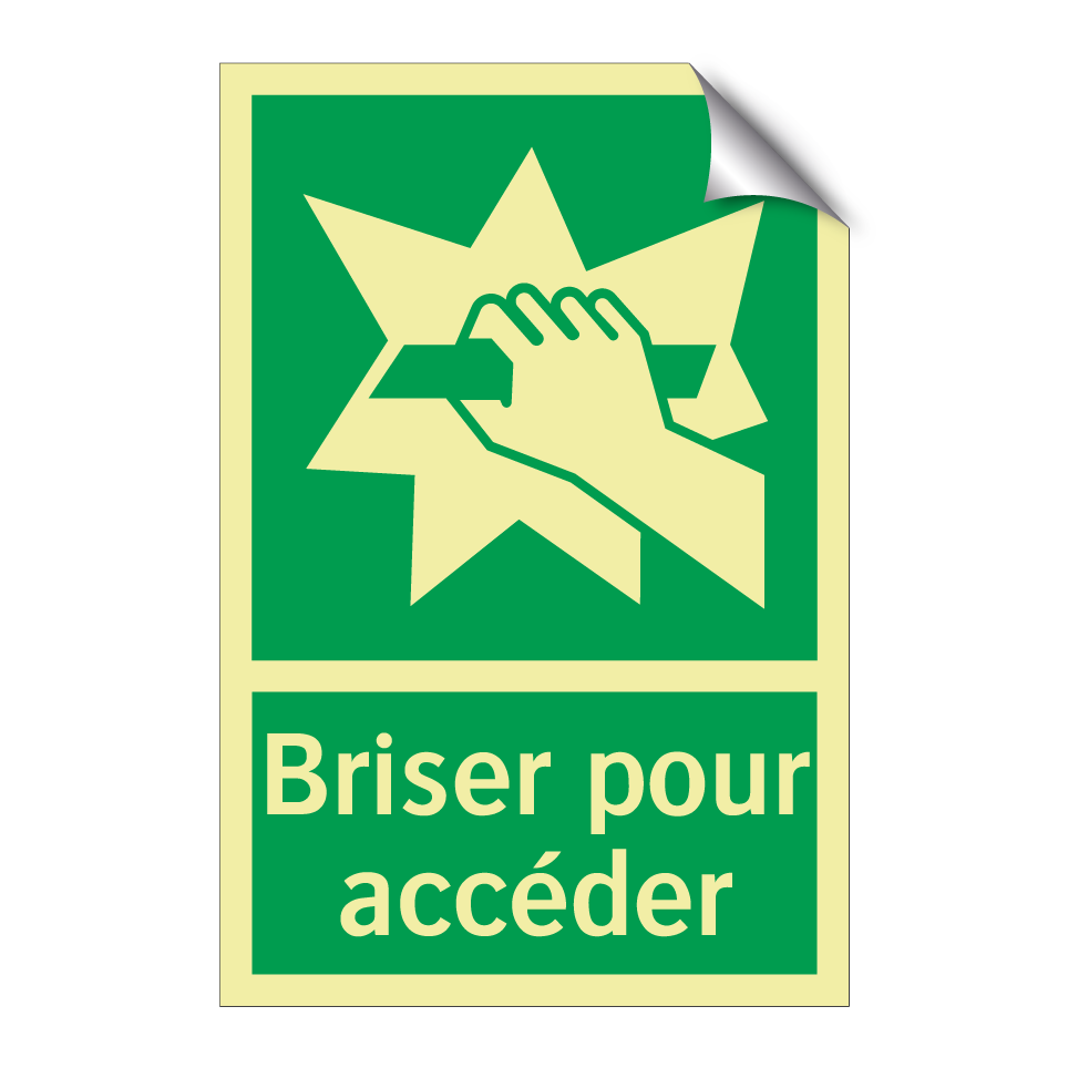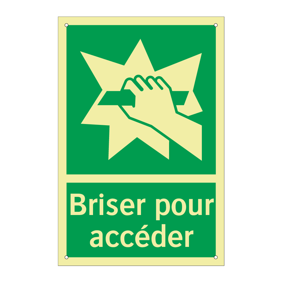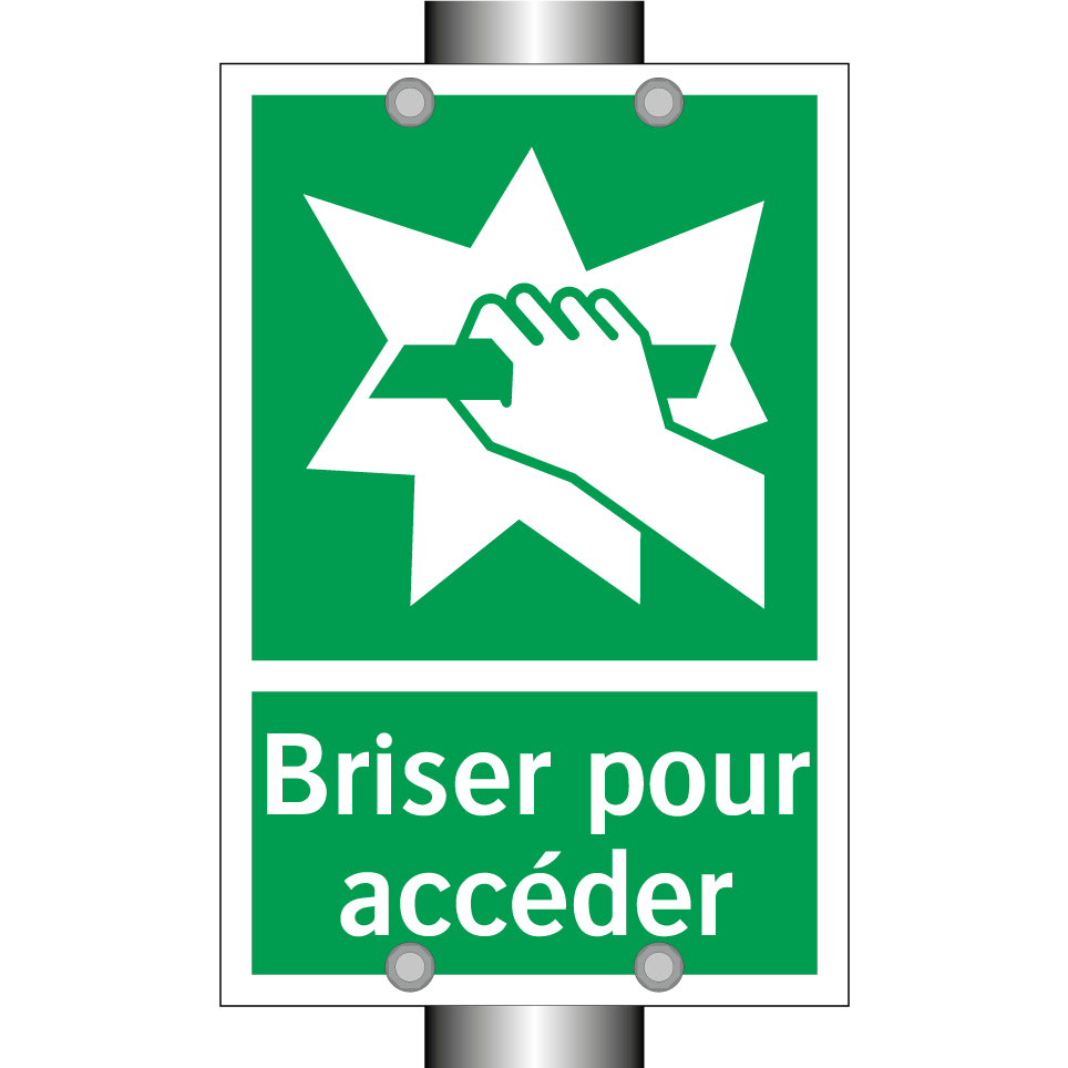 Panneau de secours avec le texte Briser pour accéder et une symbolique claire