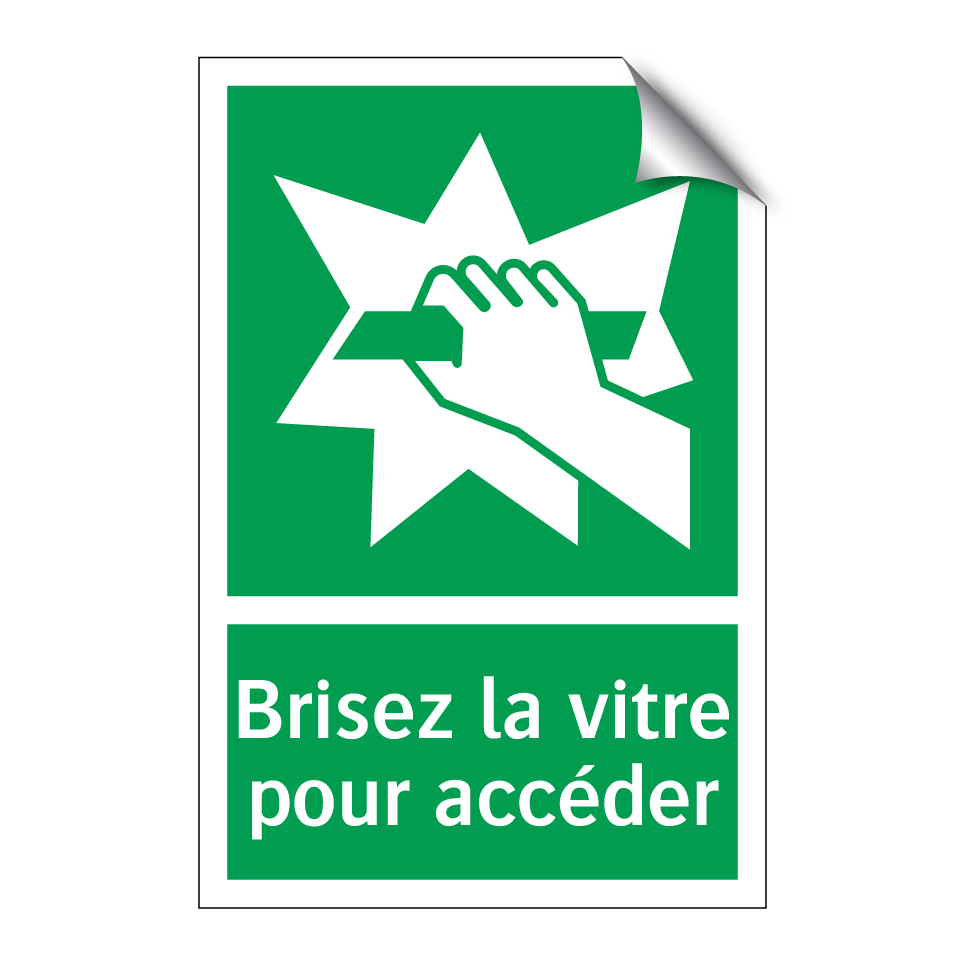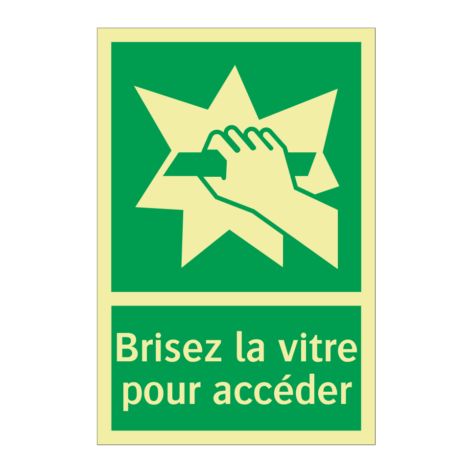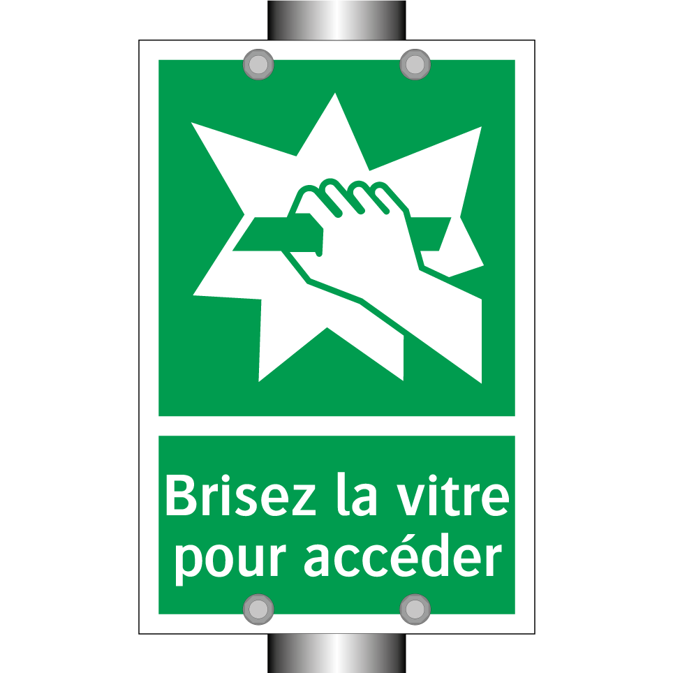 Panneau de secours avec le texte Brisez la vitre pour accéder et une symbolique claire