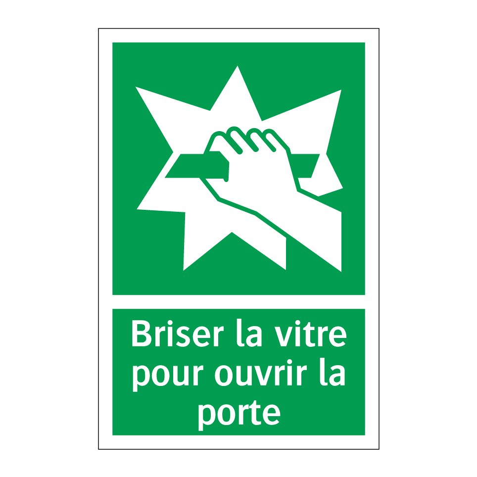 Panneau de secours avec le texte Briser la vitre pour ouvrir la porte et une symbolique claire