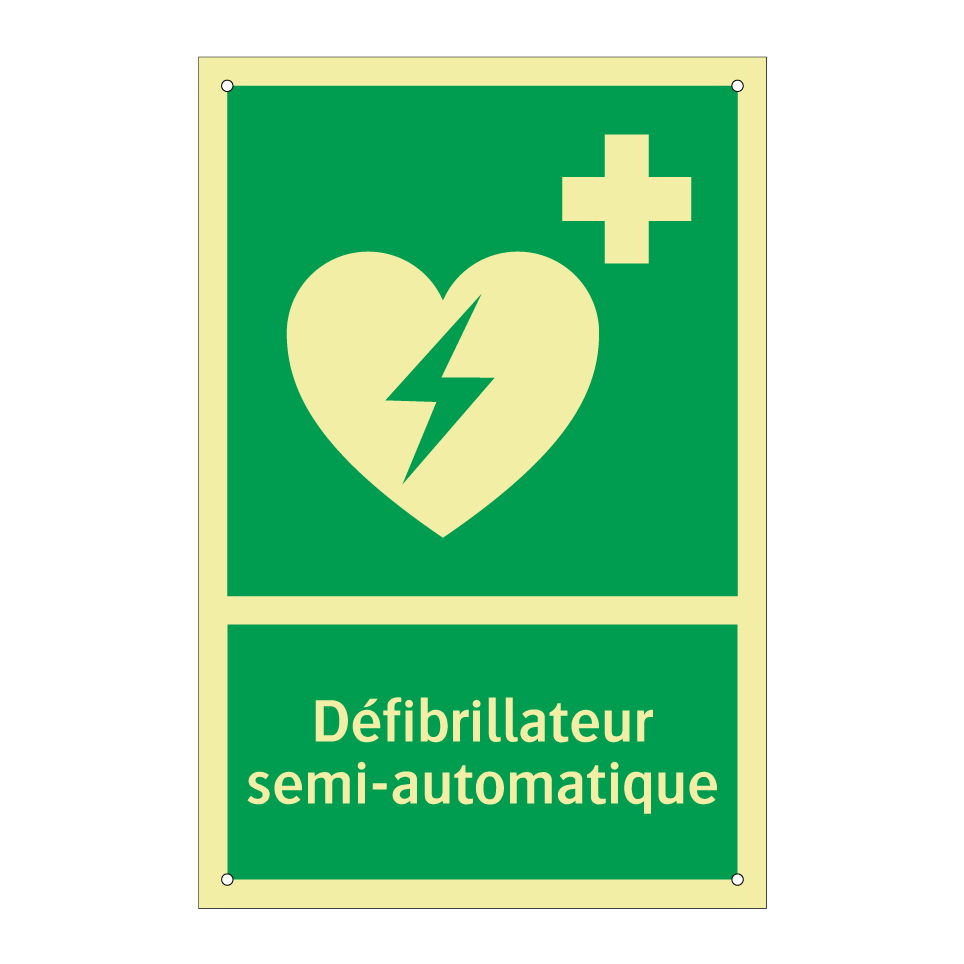 Panneau de secours avec le texte Défibrillateur semi-automatique et une symbolique claire