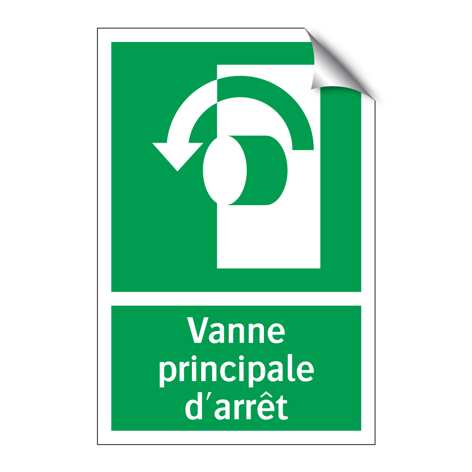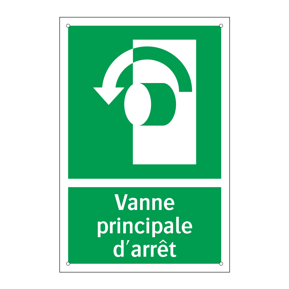 Panneau de secours avec le texte Vanne principale d'arrêt et une symbolique claire