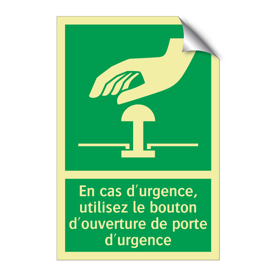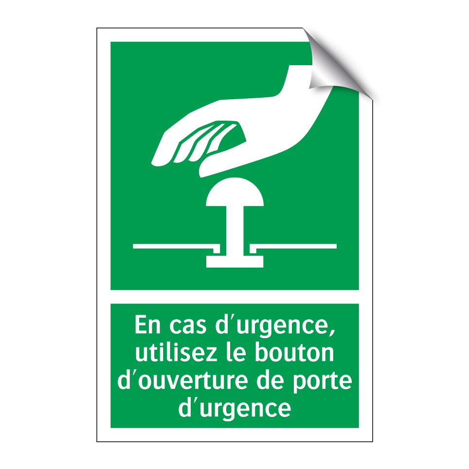 Panneau de secours avec le texte En cas d'urgence, utilisez le bouton d'ouverture de porte d'urgence et une symbolique claire