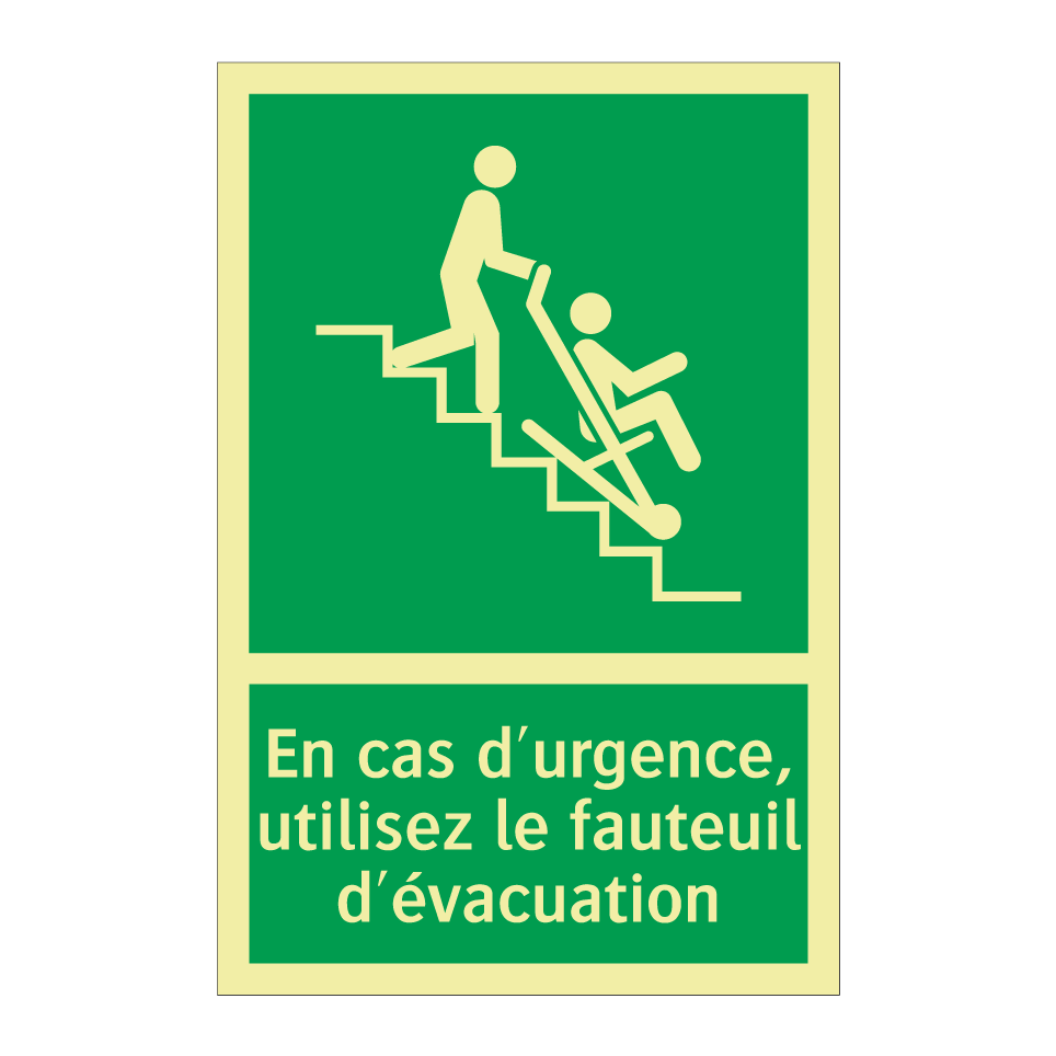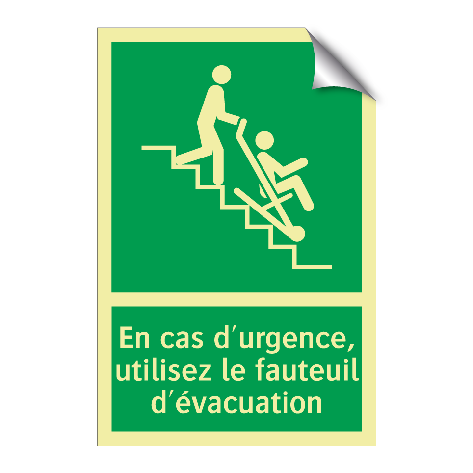 Panneau de secours avec le texte En cas d'urgence, utilisez le fauteuil d'évacuation et une symbolique claire
