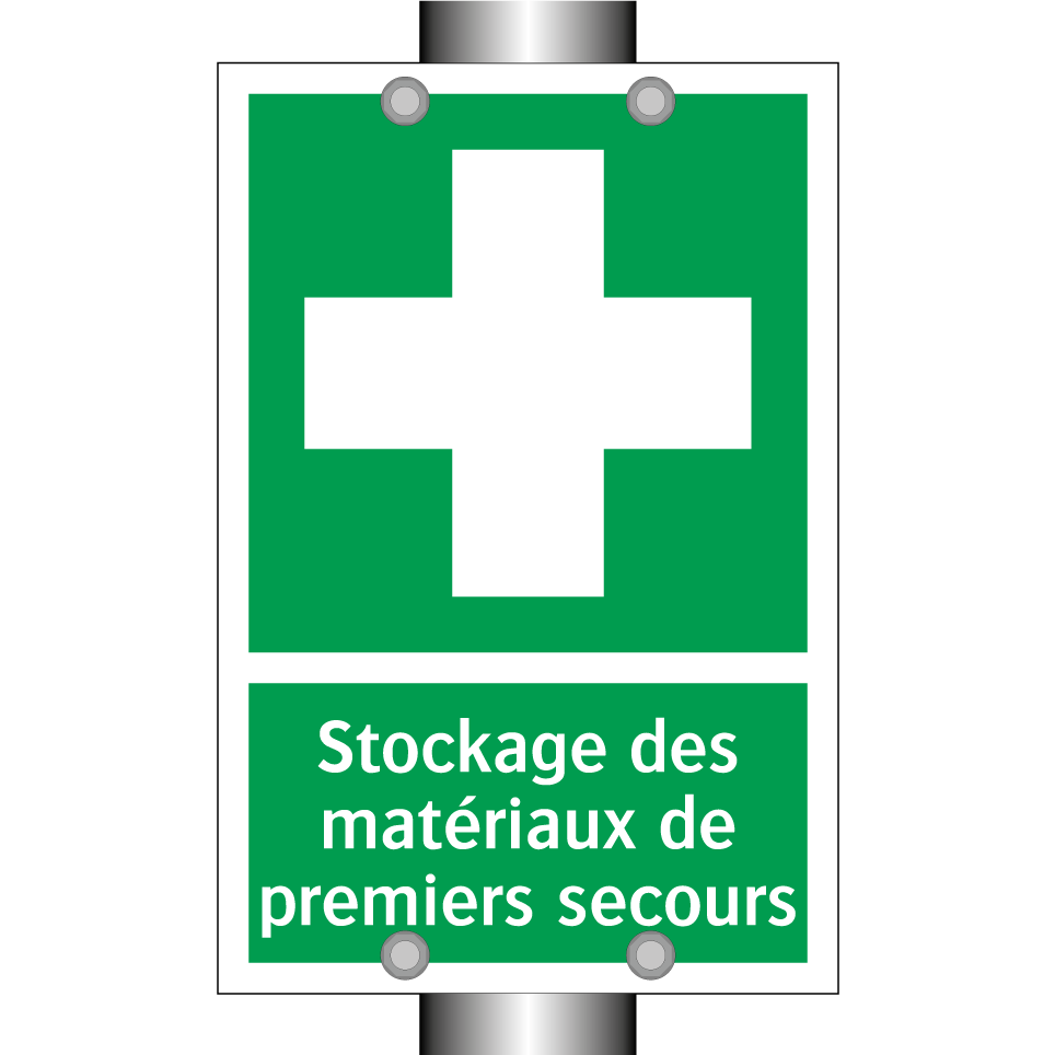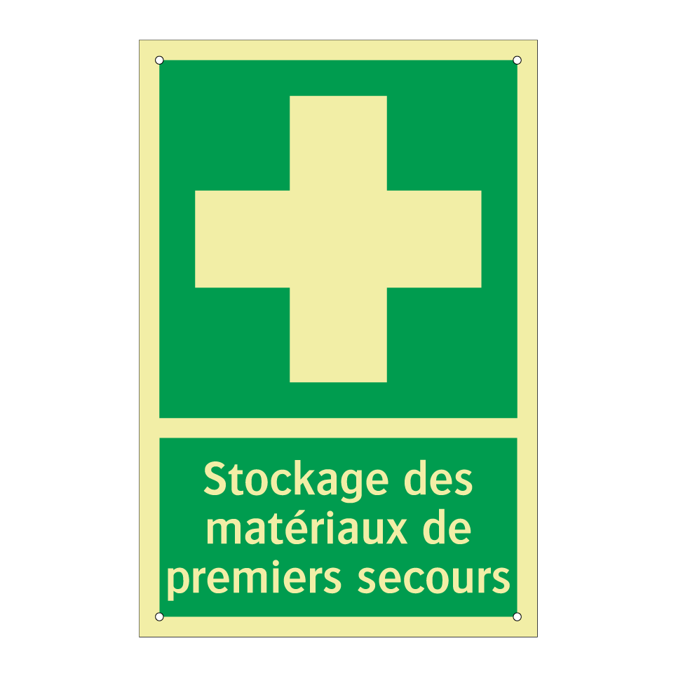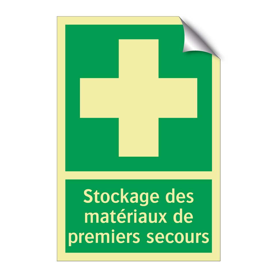 Panneau de secours avec le texte Stockage des matériaux de premiers secours et une symbolique claire