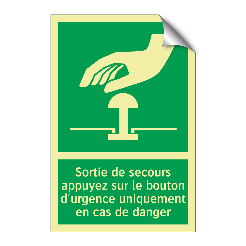 Panneau de secours avec le texte Sortie de secours appuyez sur le bouton d'urgence uniquement en cas de danger et une symbolique claire